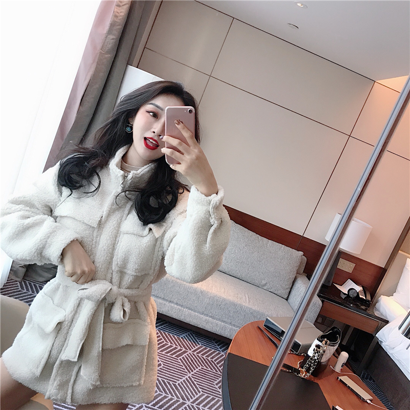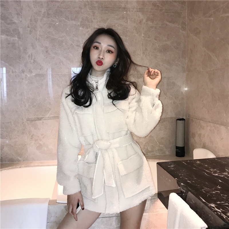韓版chic新款復古時尚小香風高領中長款系帶收腰顯瘦毛絨絨外套女