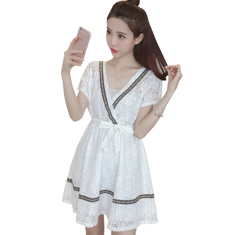 / 夏季新款女裝韓版V領收腰白色裙子修身中長款短袖蕾絲連衣裙