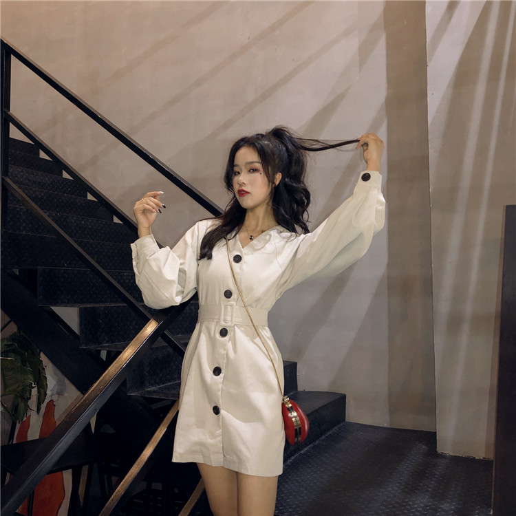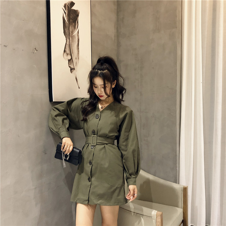 復古新款chic單排扣綁帶收腰顯瘦泡泡袖時髦氣質V領純色風衣裙潮