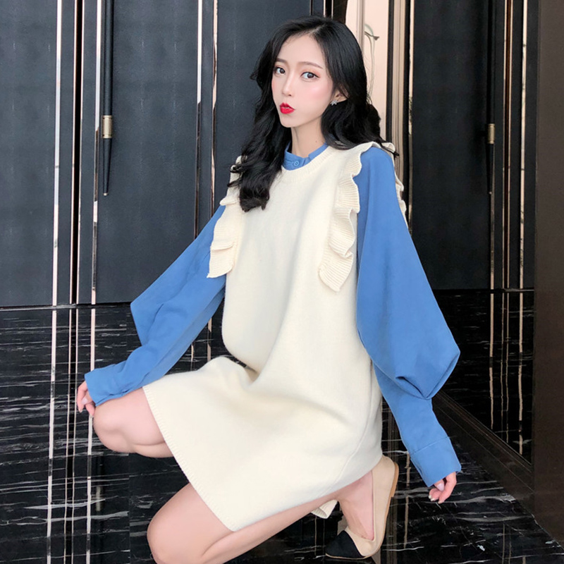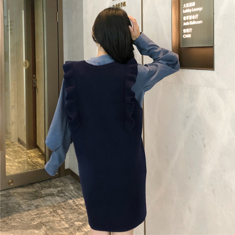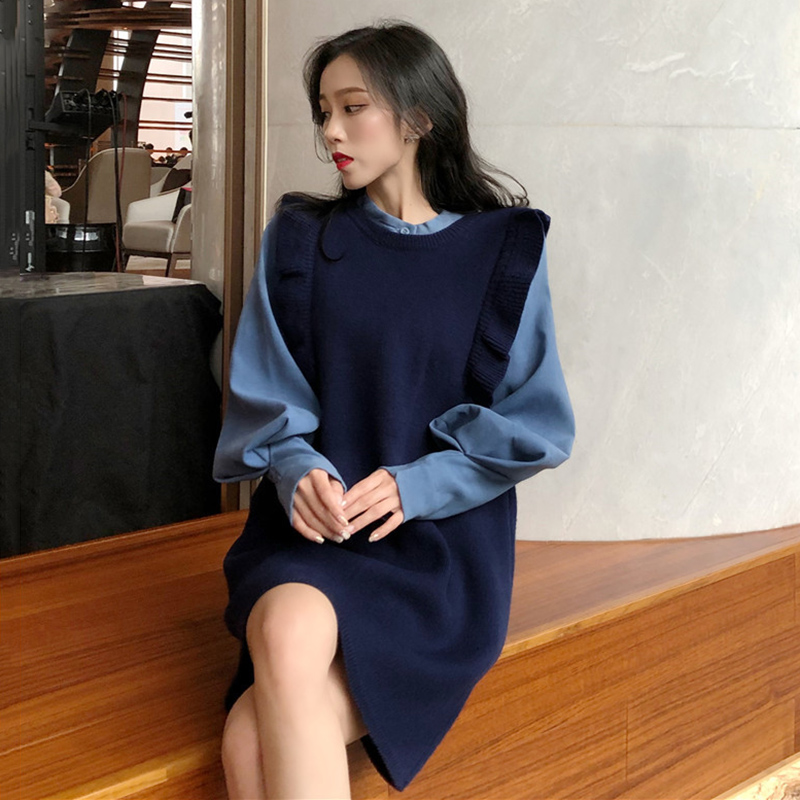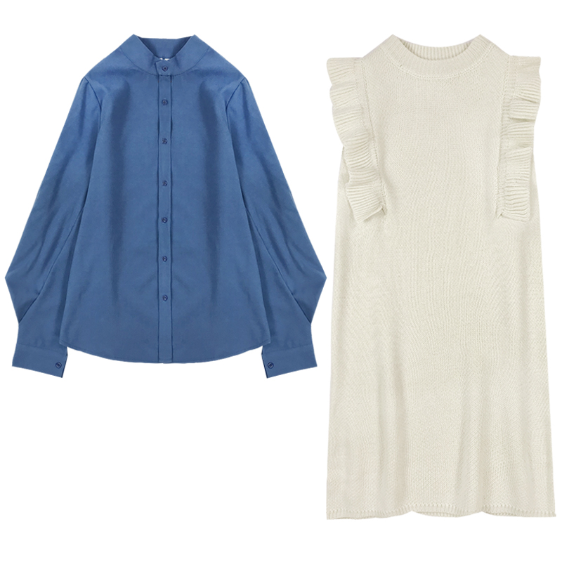 時尚套裝女秋冬新款寬松燈籠長袖打底襯衫木耳邊針織背心連衣裙子