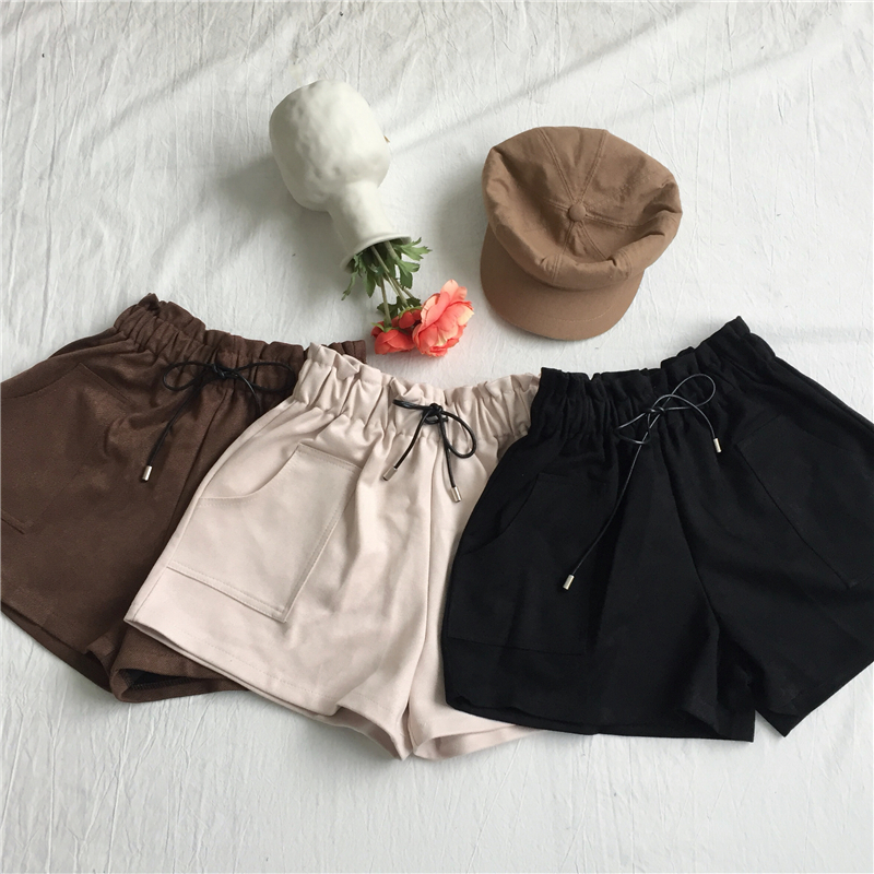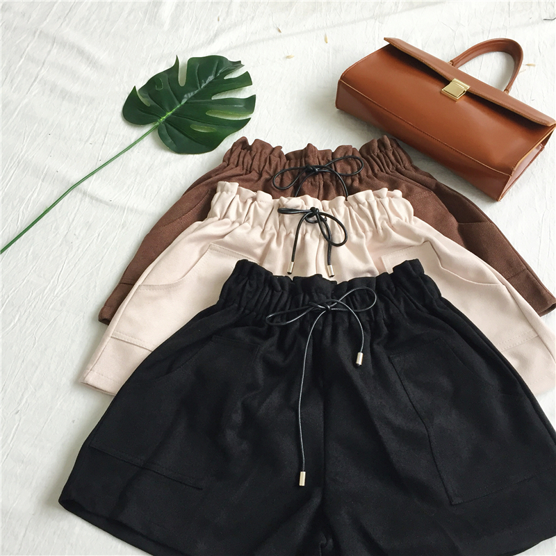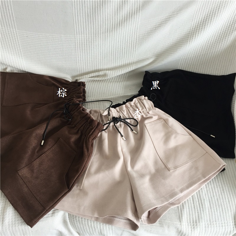 / 可可里小姐~秋冬新款韓版毛呢闊腿褲口袋寬松高腰闊腿休閑短褲