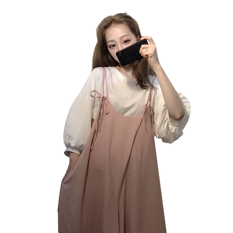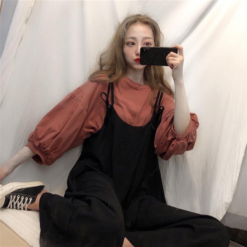 / 夏季女裝韓版時尚休閑套裝寬松吊帶闊腿褲連體褲+燈籠袖T恤兩件套