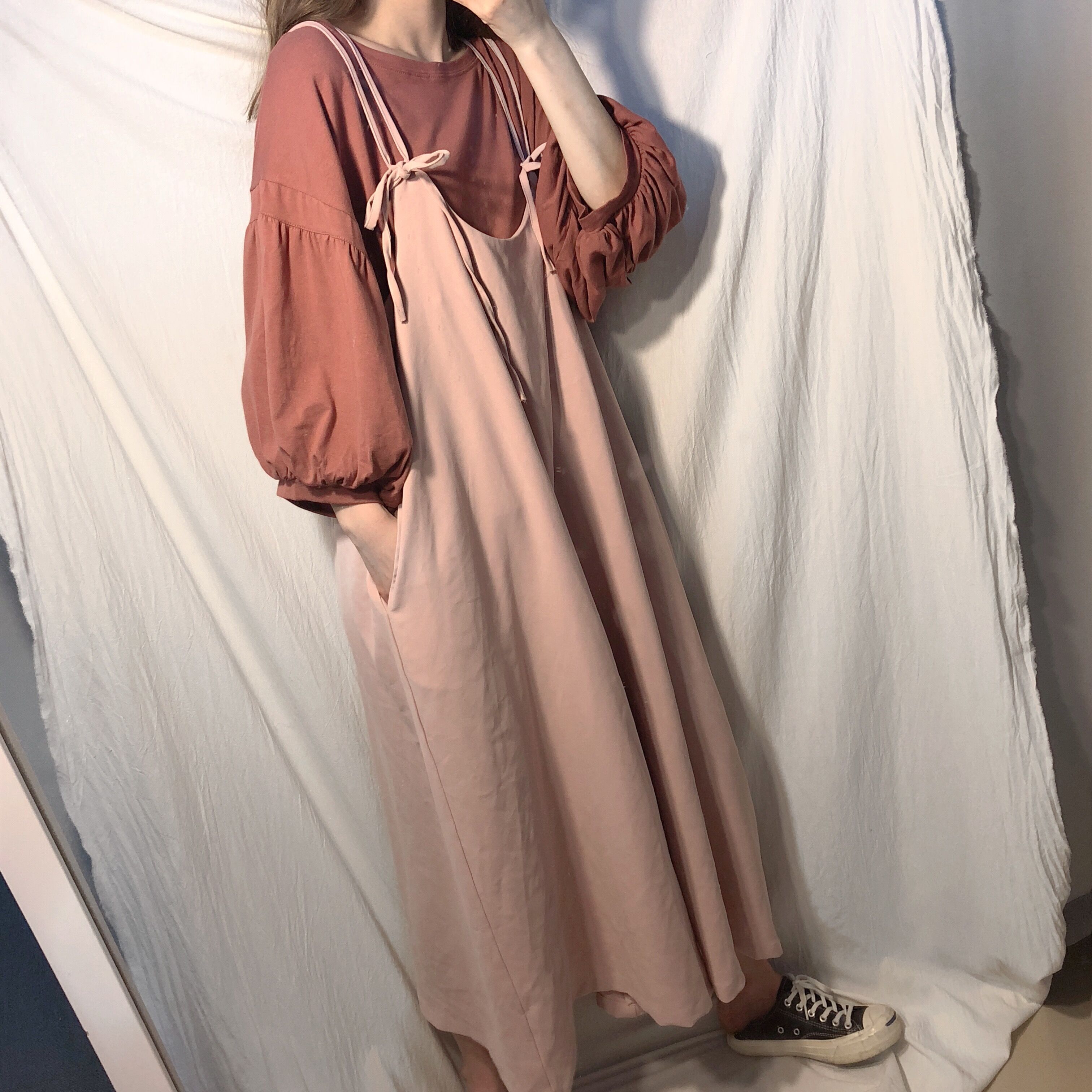 夏季女裝韓版時尚休閑套裝寬松吊帶闊腿褲連體褲+燈籠袖T恤兩件套