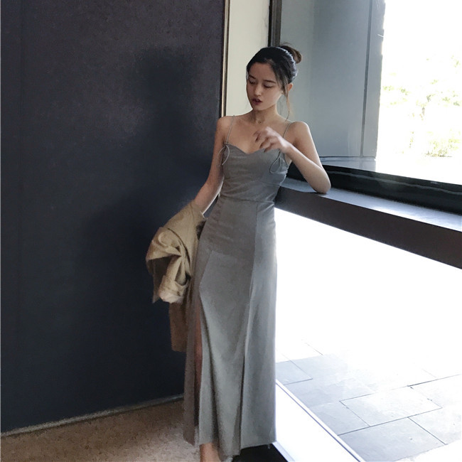 / 韓版2018新款連衣裙復古chic修身顯瘦純色百搭開叉時尚吊帶長裙女