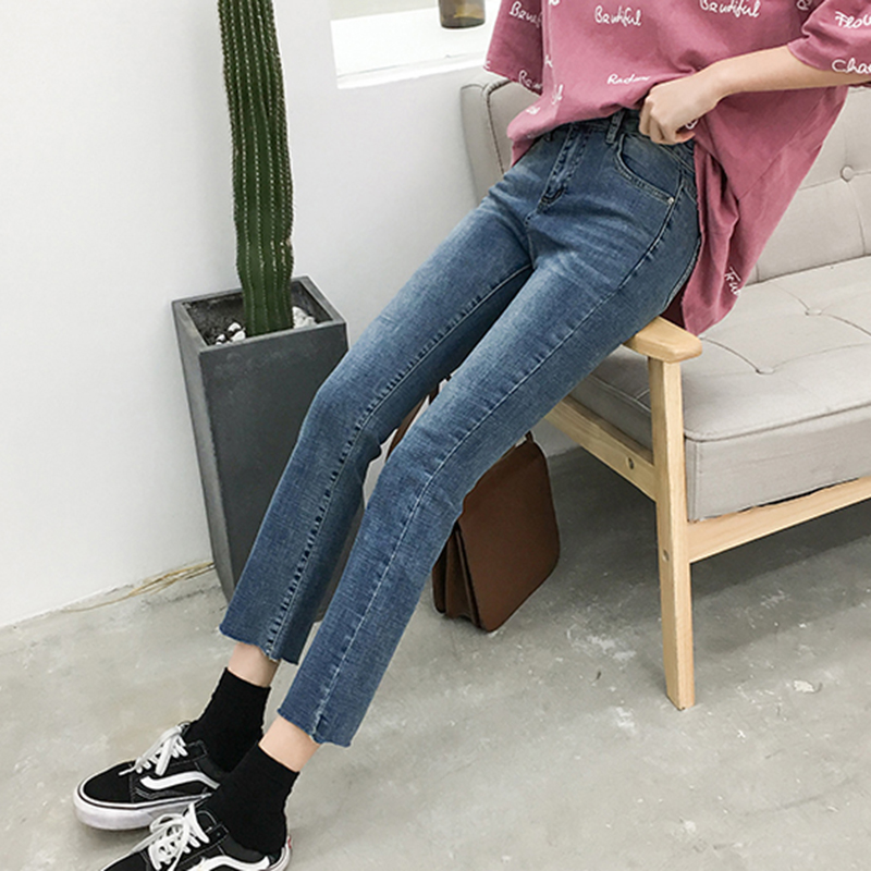 個性撕邊微喇褲潮秋裝女2018新款學生時尚牛仔褲高腰顯瘦九分褲子