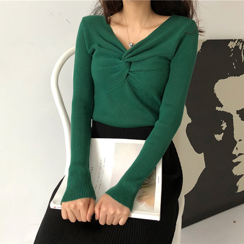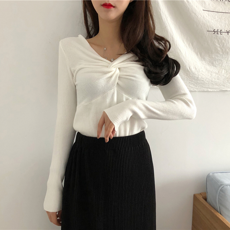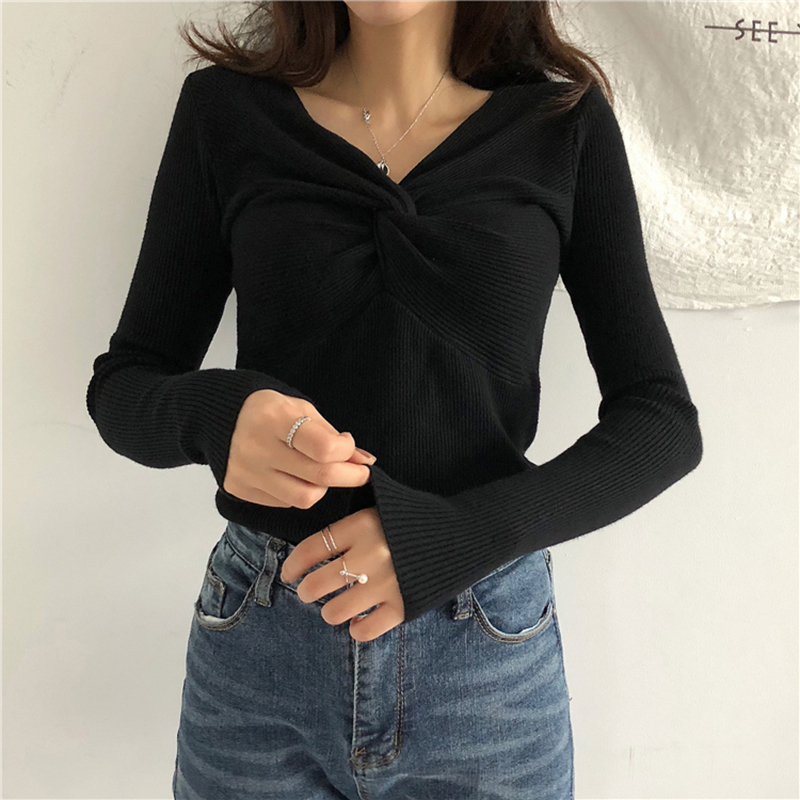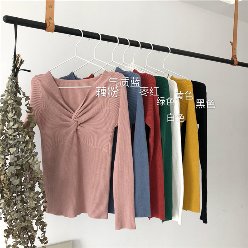 秋裝女2018新款chic風百搭套頭針織衫長袖交叉紐結純色打底衫毛衣