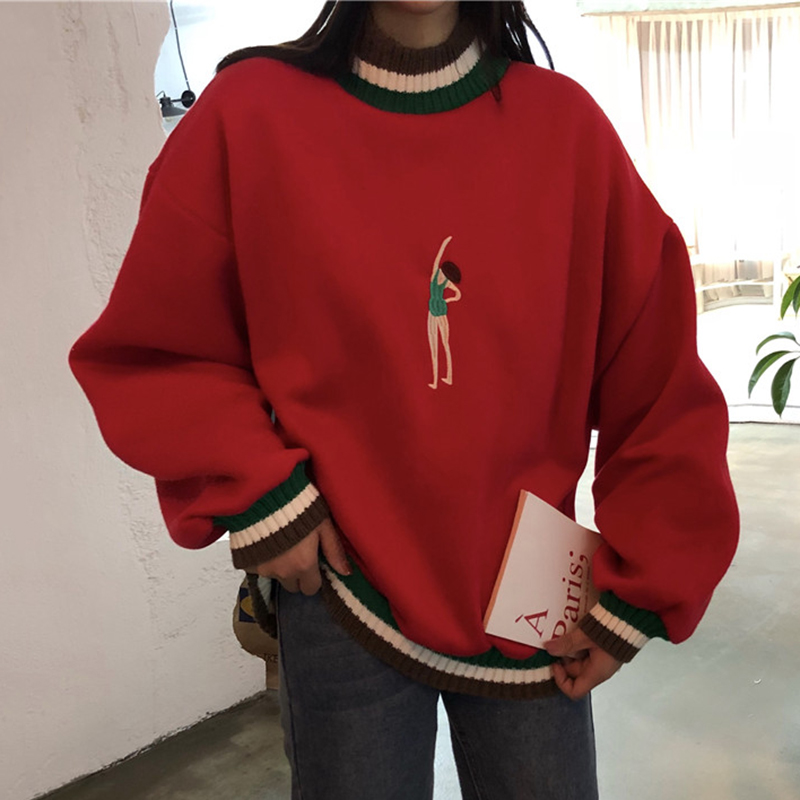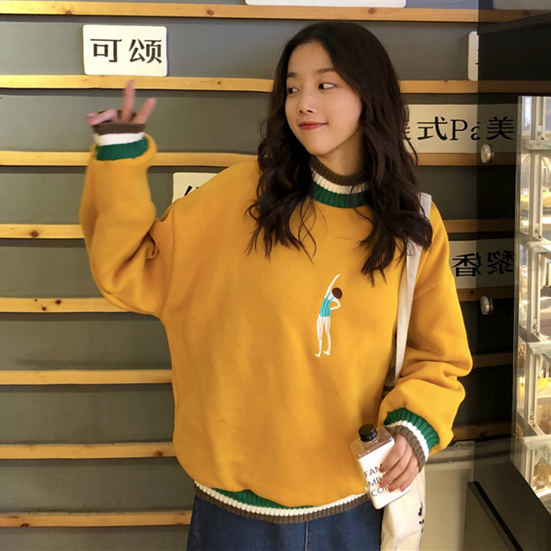 秋冬女裝2018新款韓版寬松小高領套頭衛衣學生刺繡小人加絨衫外套