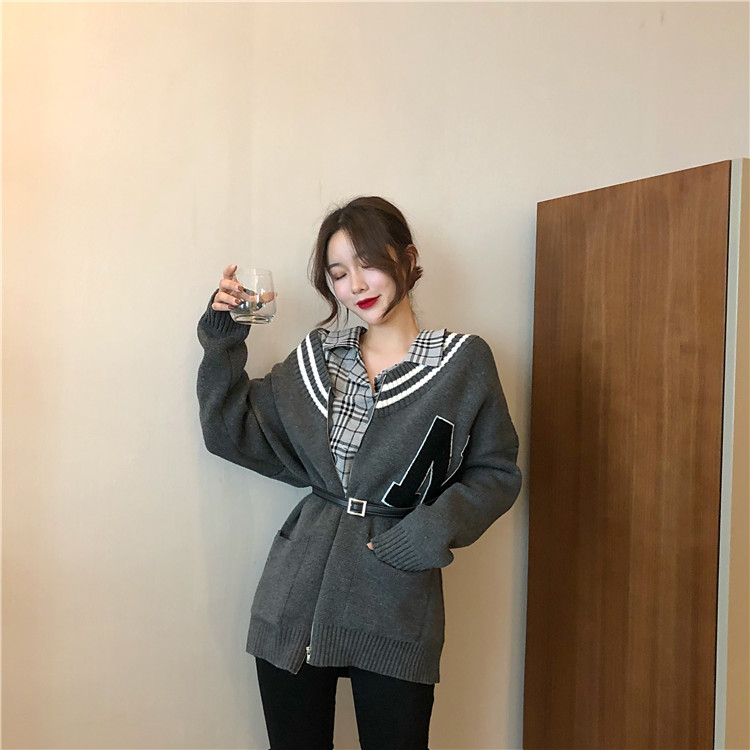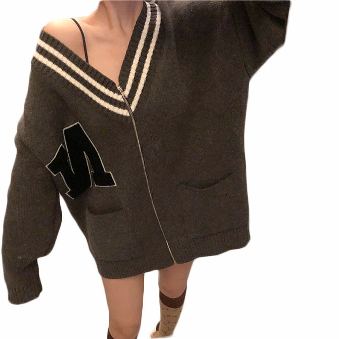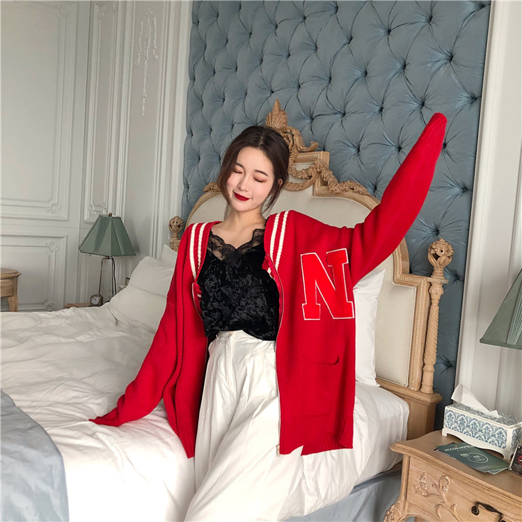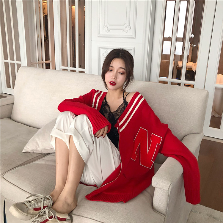 復古韓國chic風寬松V領棒球針織毛衣女2018新款N字母拉鏈開衫外套