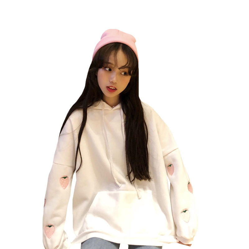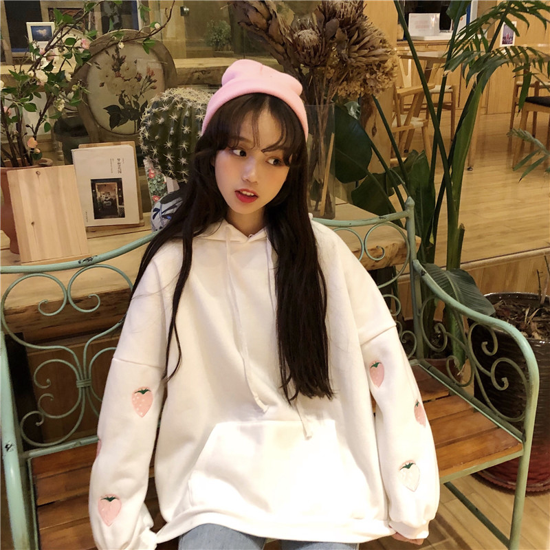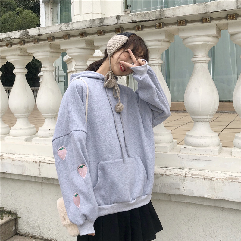 / 秋冬女裝韓版BF風寬松刺繡草莓連帽加絨加厚套頭超火衛衣上衣外套