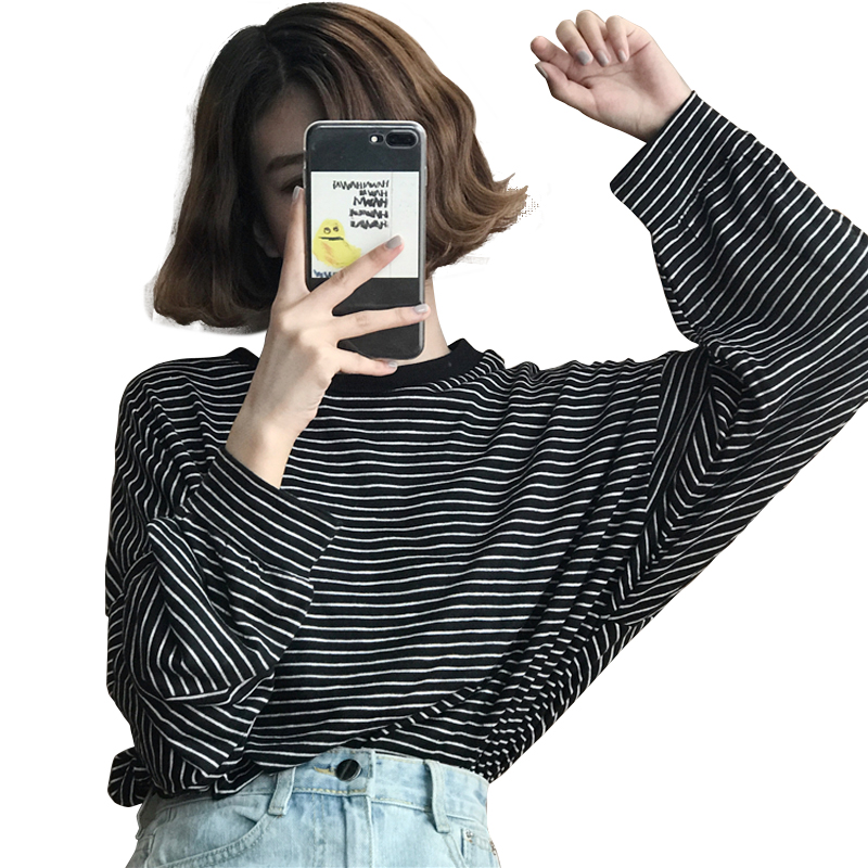 秋裝女裝韓版復古寬松長袖針織衫百搭圓領顯瘦條紋T恤打底衫上衣