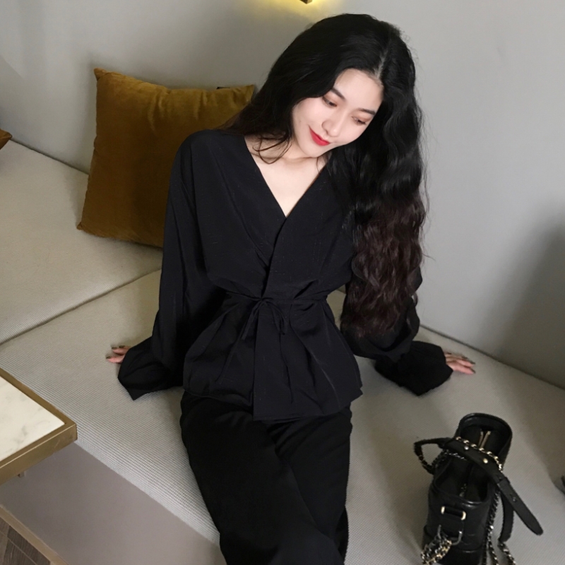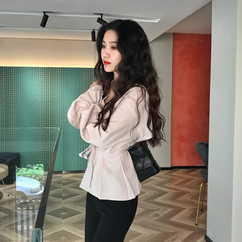 / chic早秋新款韓版復古時尚襯衫百搭氣質寬松收腰系帶喇叭袖上衣女