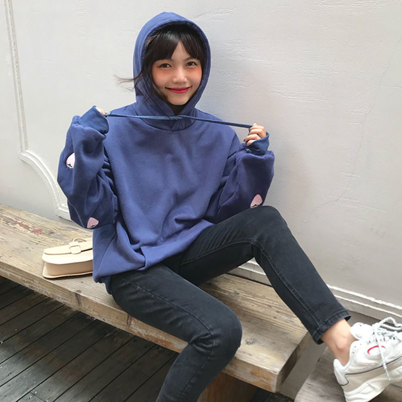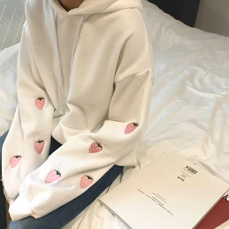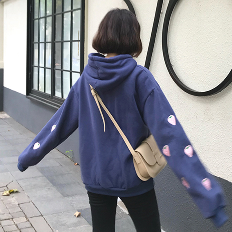 2018新款女裝慵懶寬松長袖草莓印花衛衣學生秋冬加絨連帽上衣外套