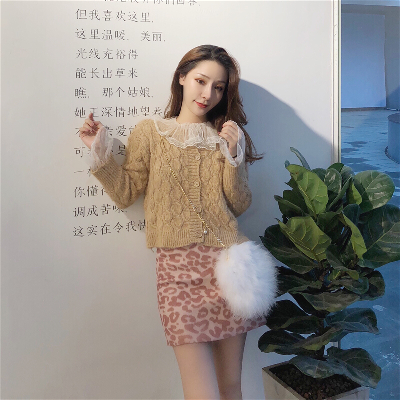 / 韓版仙女荷葉邊翻領打底衫+豹紋包臀裙+單排扣圓領毛衣女2018新款
