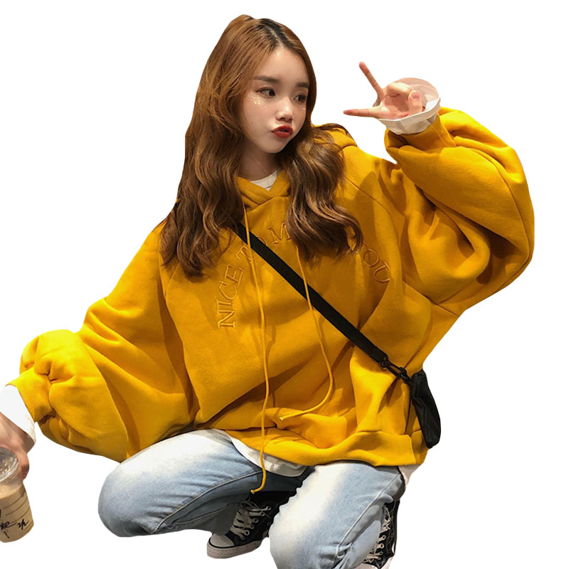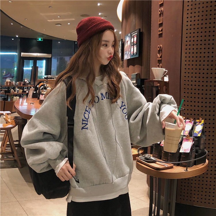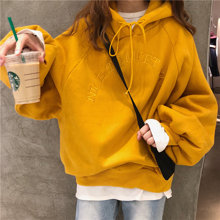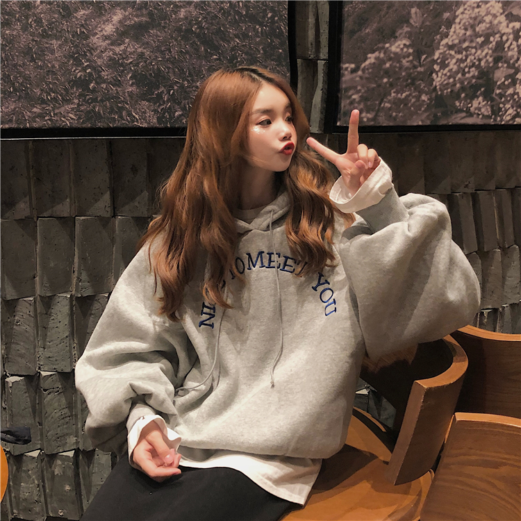 2018新款秋冬韓版寬松純色慵懶風字母刺繡連帽套頭衛衣上衣外套女