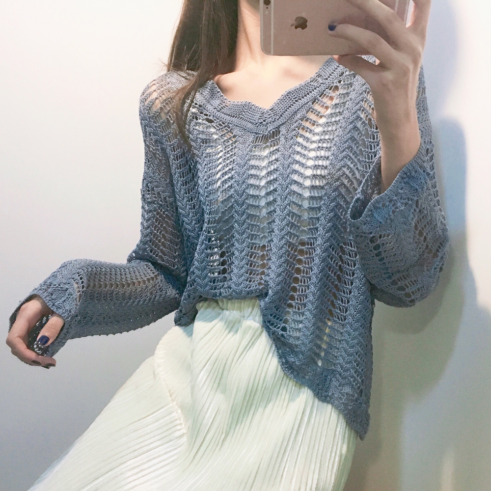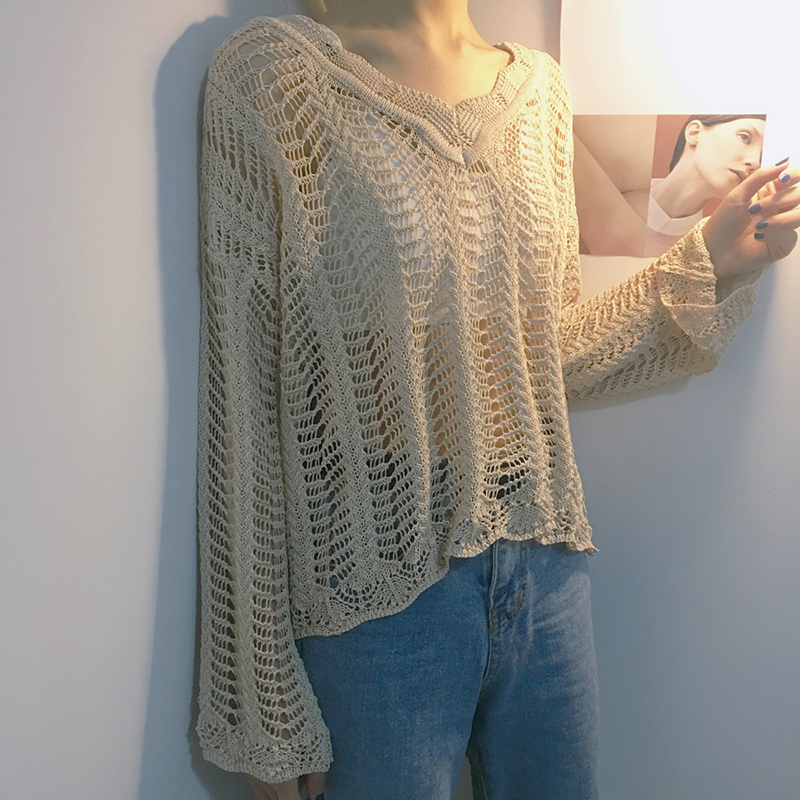 / 春裝2018新款女裝花邊v領鏤空罩衫復古短款空調衫透視薄針織上衣