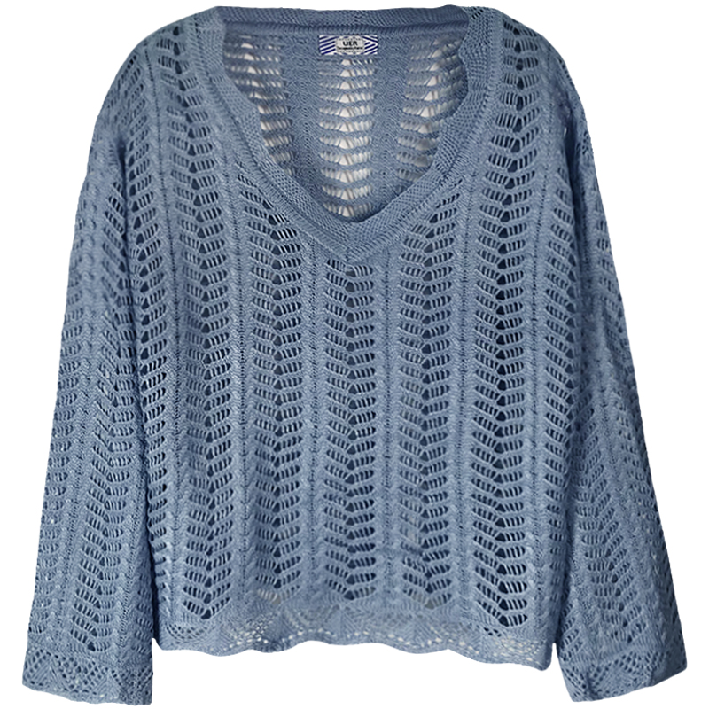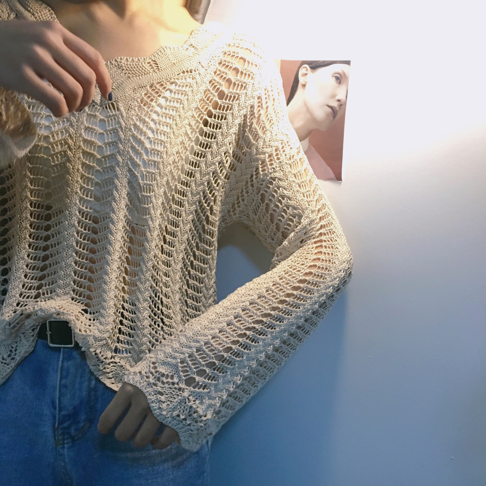 春裝2018新款女裝花邊v領鏤空罩衫復古短款空調衫透視薄針織上衣