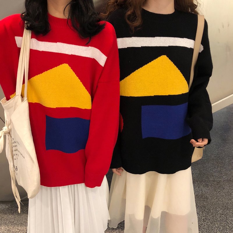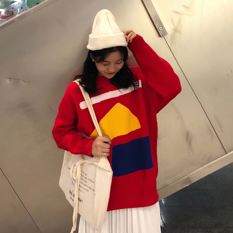 chic撞色套頭毛衣外套女秋冬裝2018新款韓版慵懶風寬松長袖針織衫