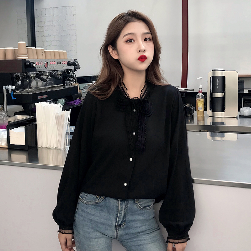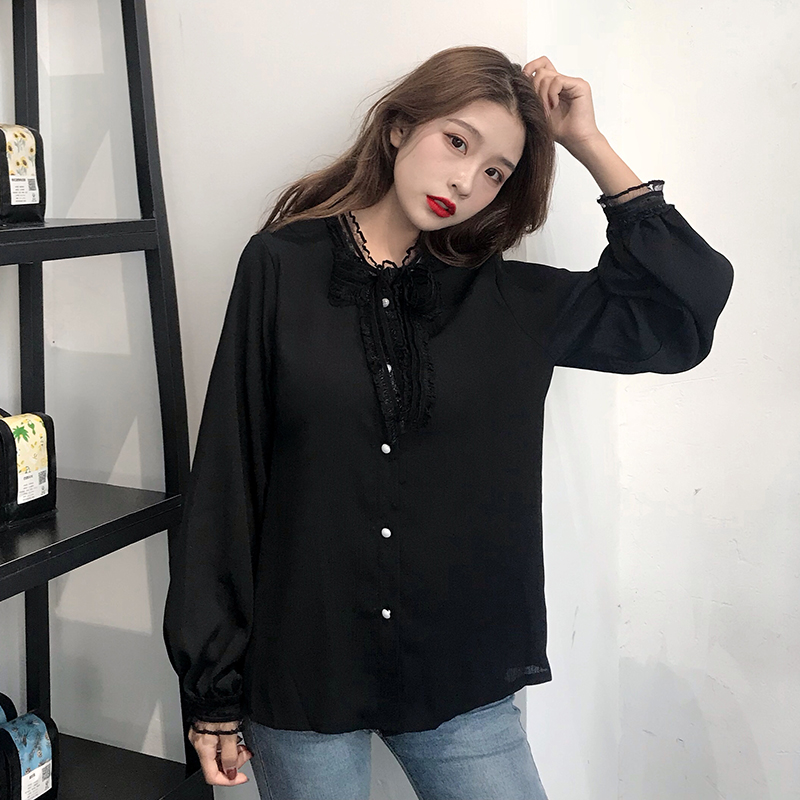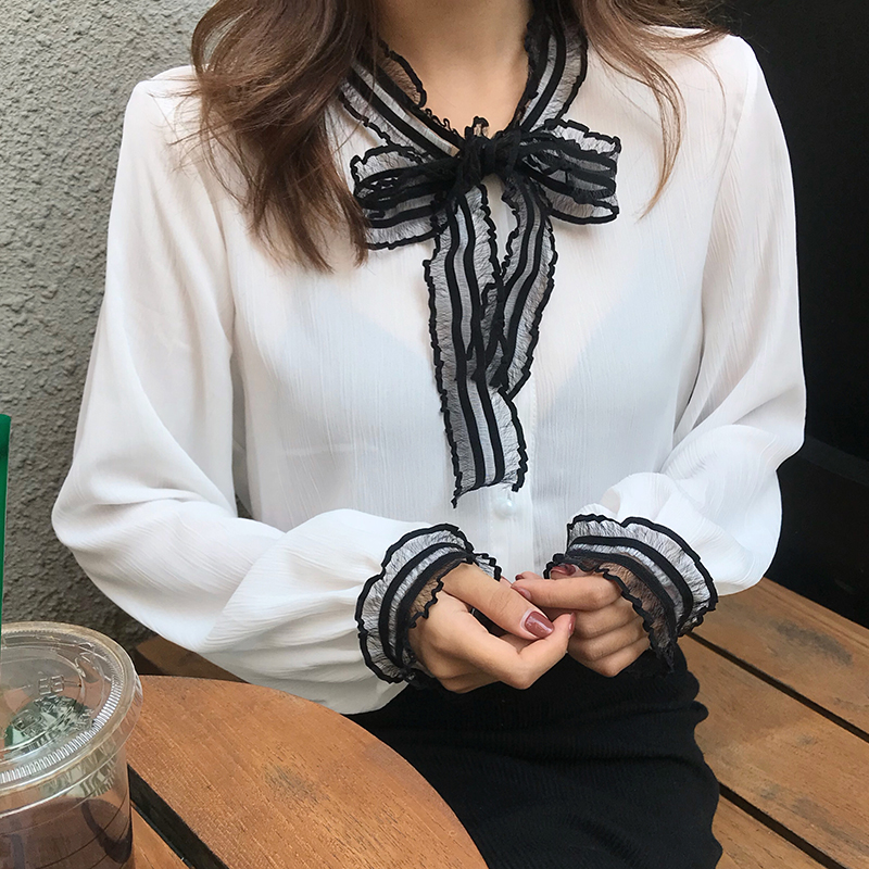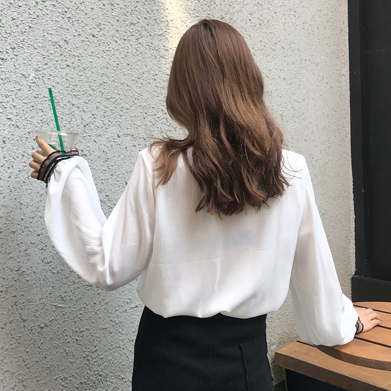 秋冬女裝2018新款時尚蝴蝶結燈籠袖白色雪紡襯衫學生復古休閑上衣