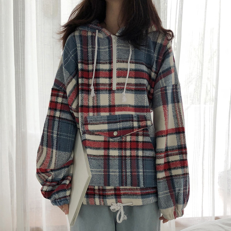 / 毛呢格子連帽衛衣2018新款女秋冬裝港風時尚抽繩慵懶外套休閑上衣