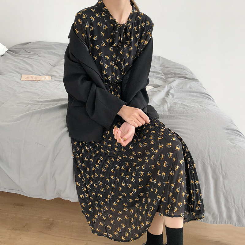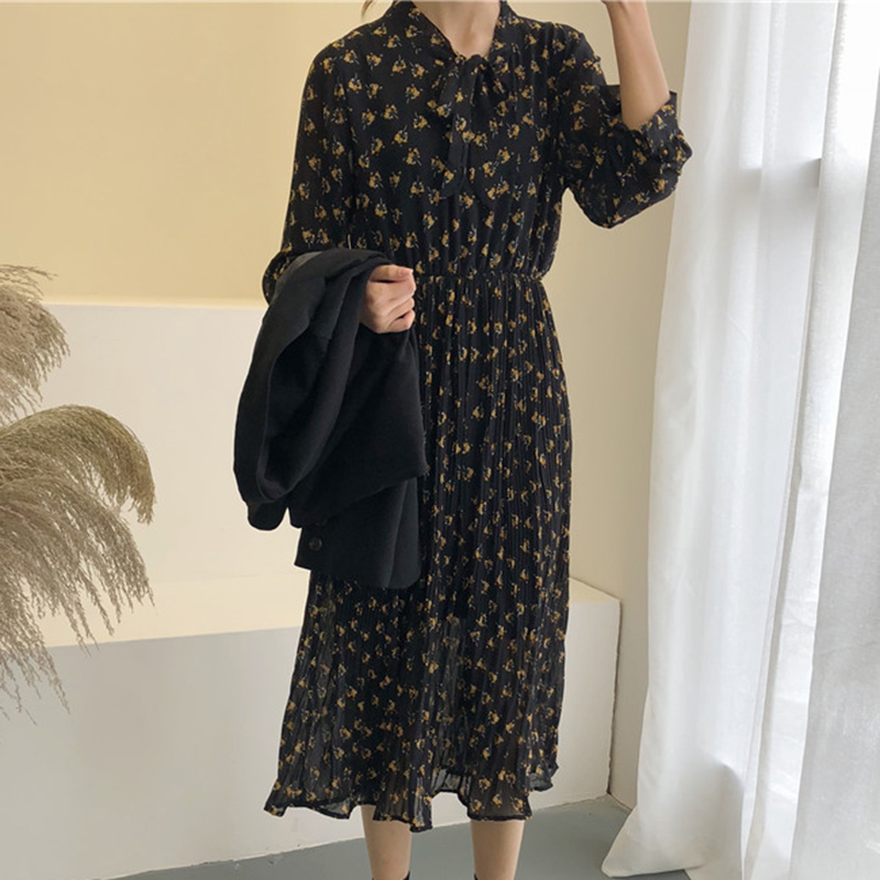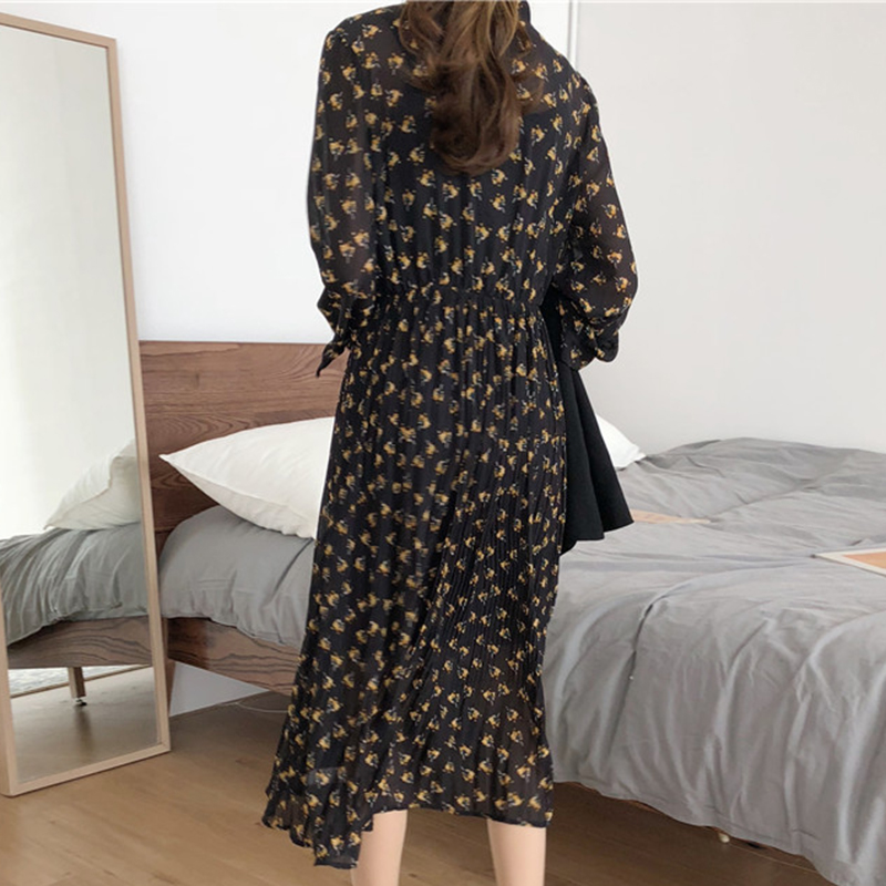 秋裝女2018新款法式少女茶歇裙百褶碎花雪紡連衣裙長裙女秋冬學生