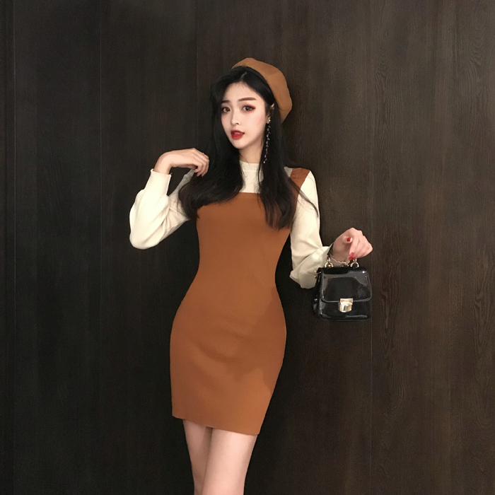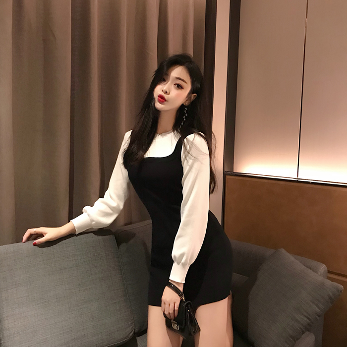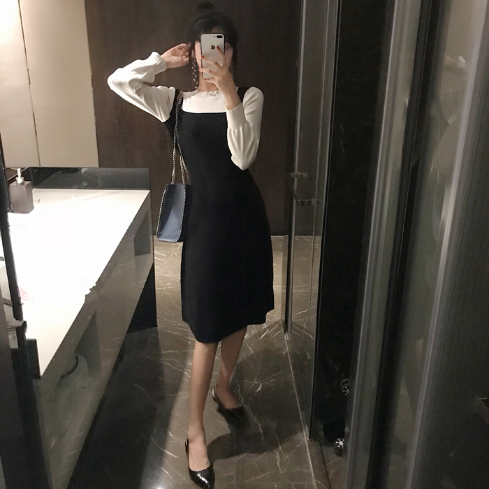 / 韓版秋冬時尚chic復古風假兩件拼色百搭針織連衣裙顯瘦長袖裙子女