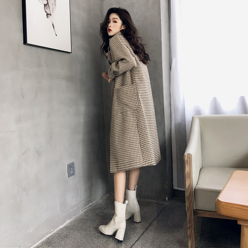 復古格子西裝領氣質長款毛呢外套秋冬女裝新款寬松長袖呢子大衣潮