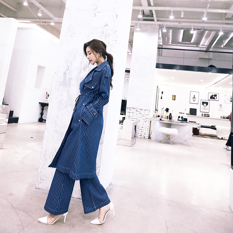 / 2018時尚秋韓版條紋中長款帥氣風衣外套時髦兩件套長闊腿褲套裝女