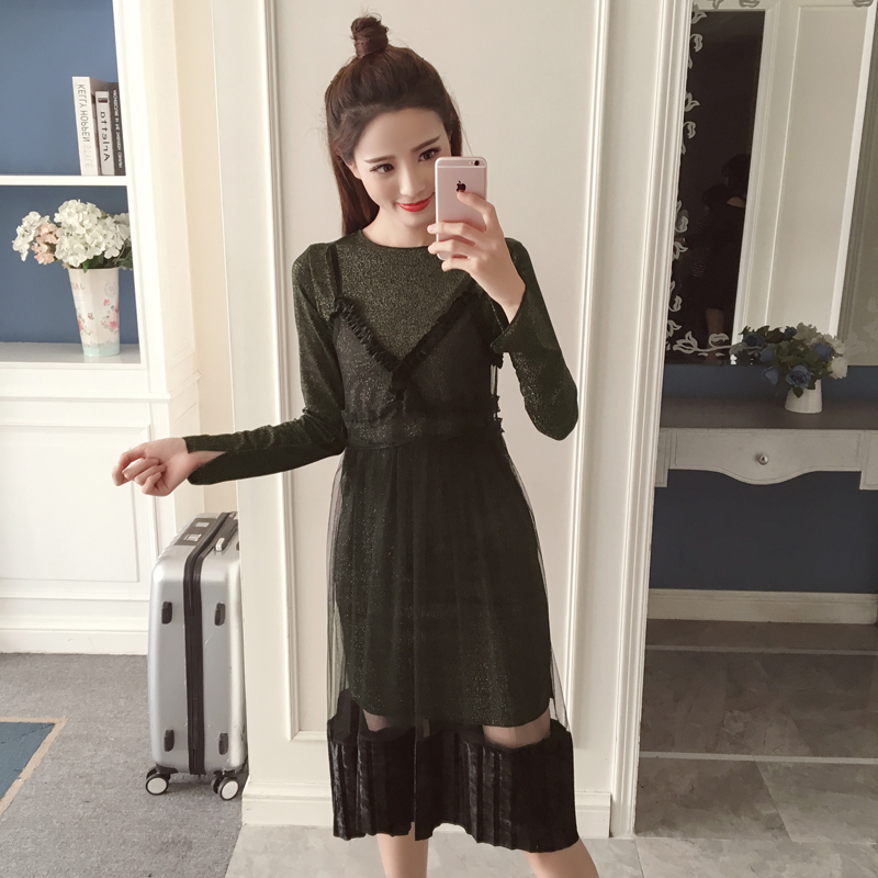 / 春裝新款女裝韓版網紗吊帶裙兩件套顯瘦中長款長袖打底連衣裙