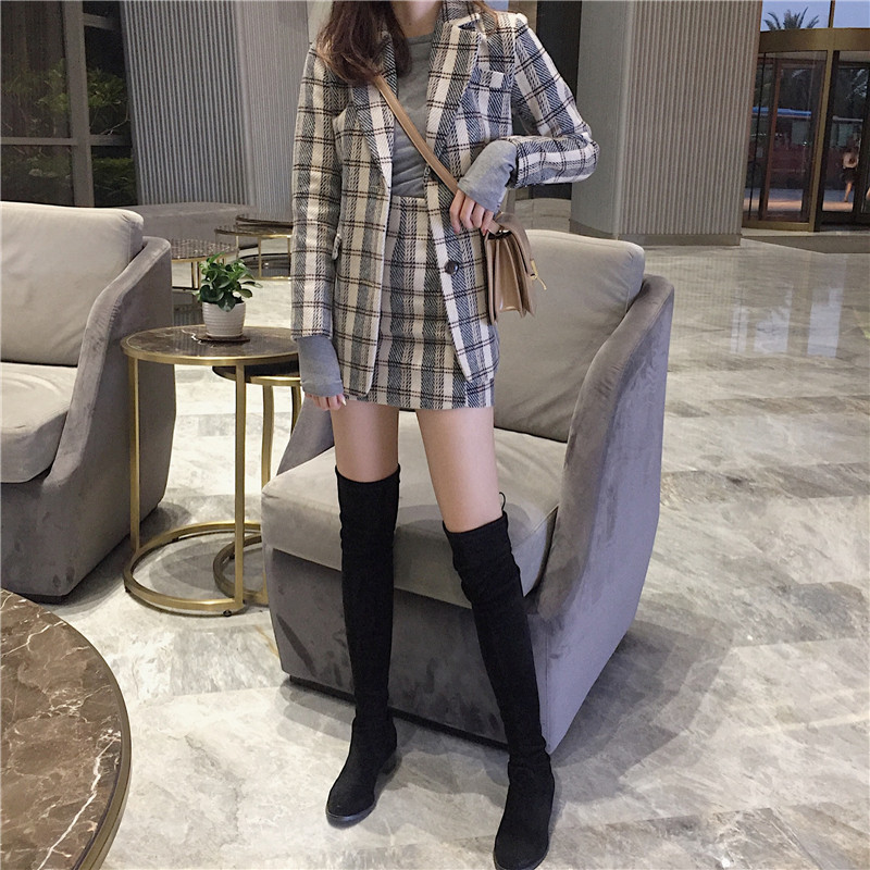 / 新款兩件套女英倫復古格子毛呢小西裝外套高腰修身包臀半身裙套裝
