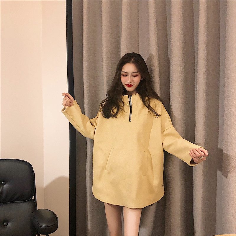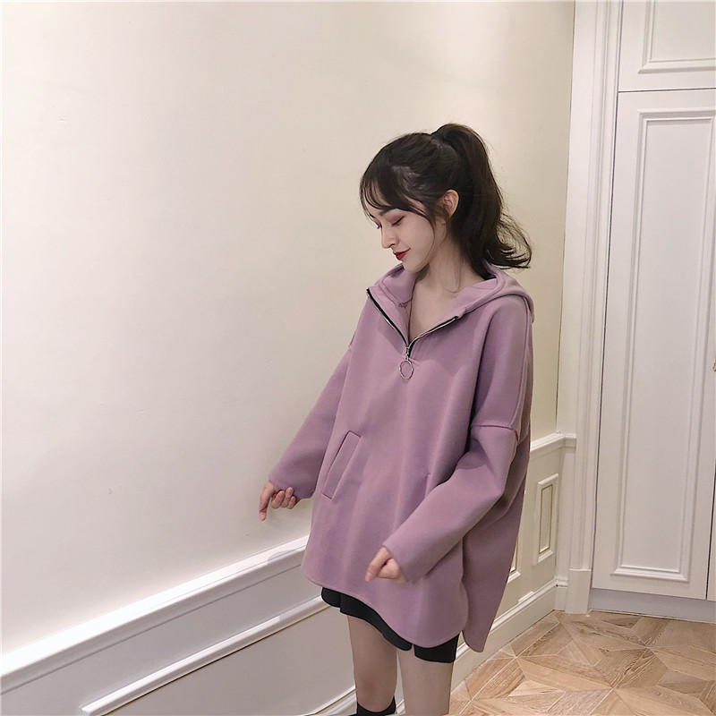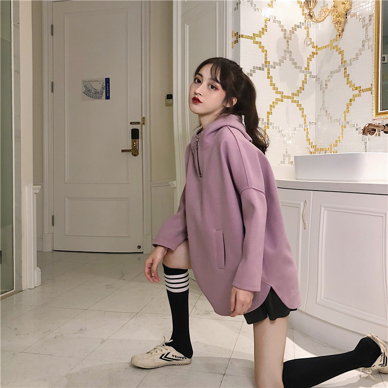 / 韓版學院風連帽中長款呢料拉鏈套頭衛衣女2018新款復古加厚上衣
