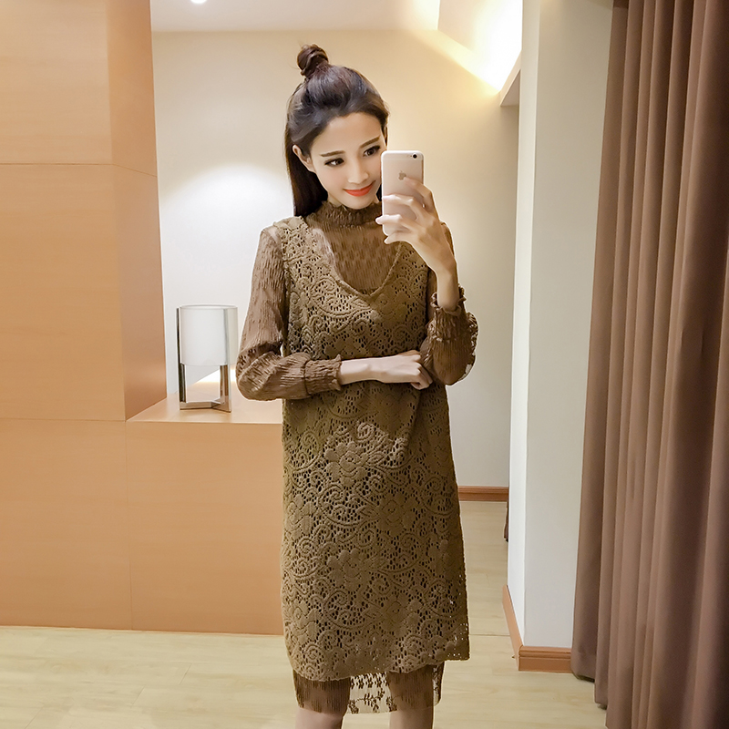 / 早春新款女裝韓版蕾絲背帶裙兩件套春秋中長款修身長袖連衣裙