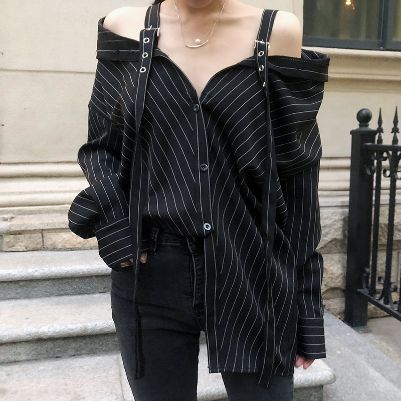 / 夏季新款女裝個性吊帶豎條紋露肩寬松顯瘦學生百搭長袖襯衫上衣女