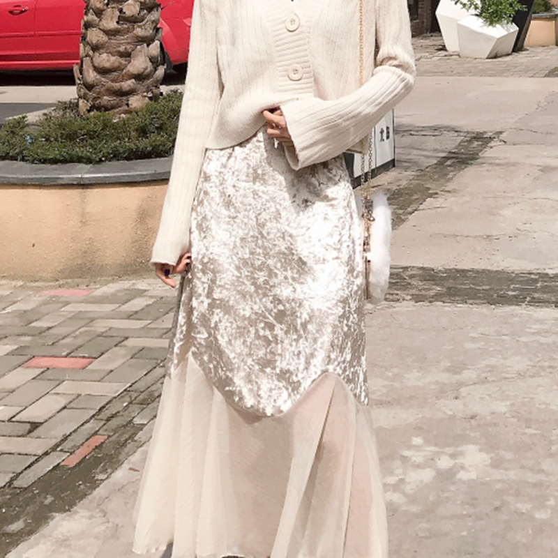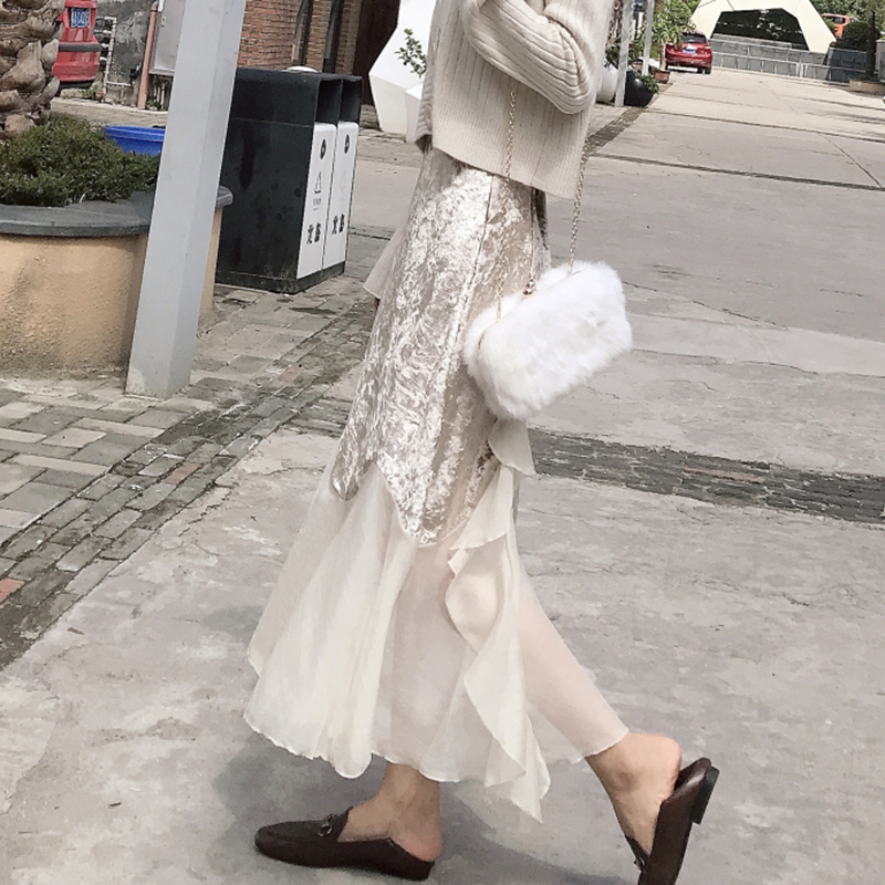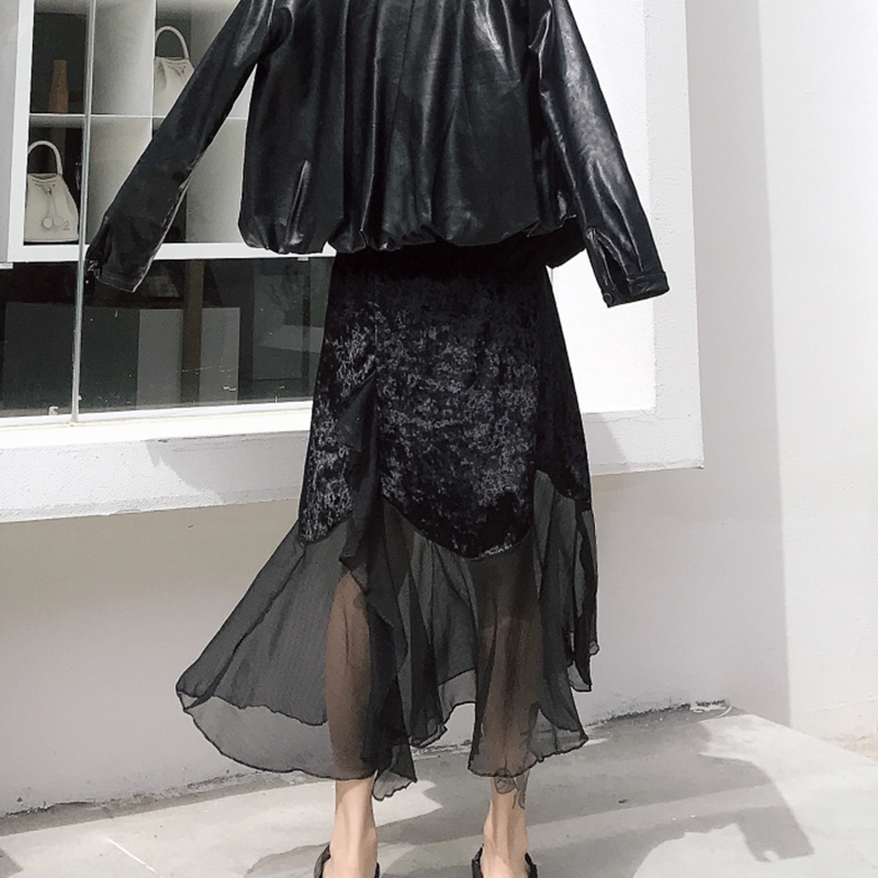 氣質雪紡拼接復古絲絨半身裙子女秋裝2018新款顯瘦黑色a字中長裙