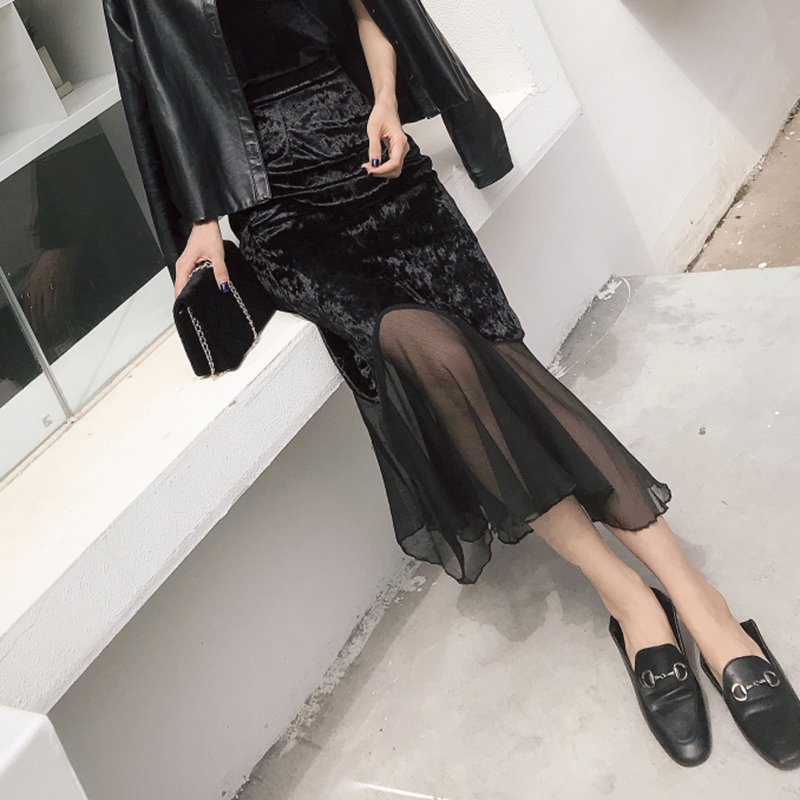 / 氣質雪紡拼接復古絲絨半身裙子女秋裝2018新款顯瘦黑色a字中長裙