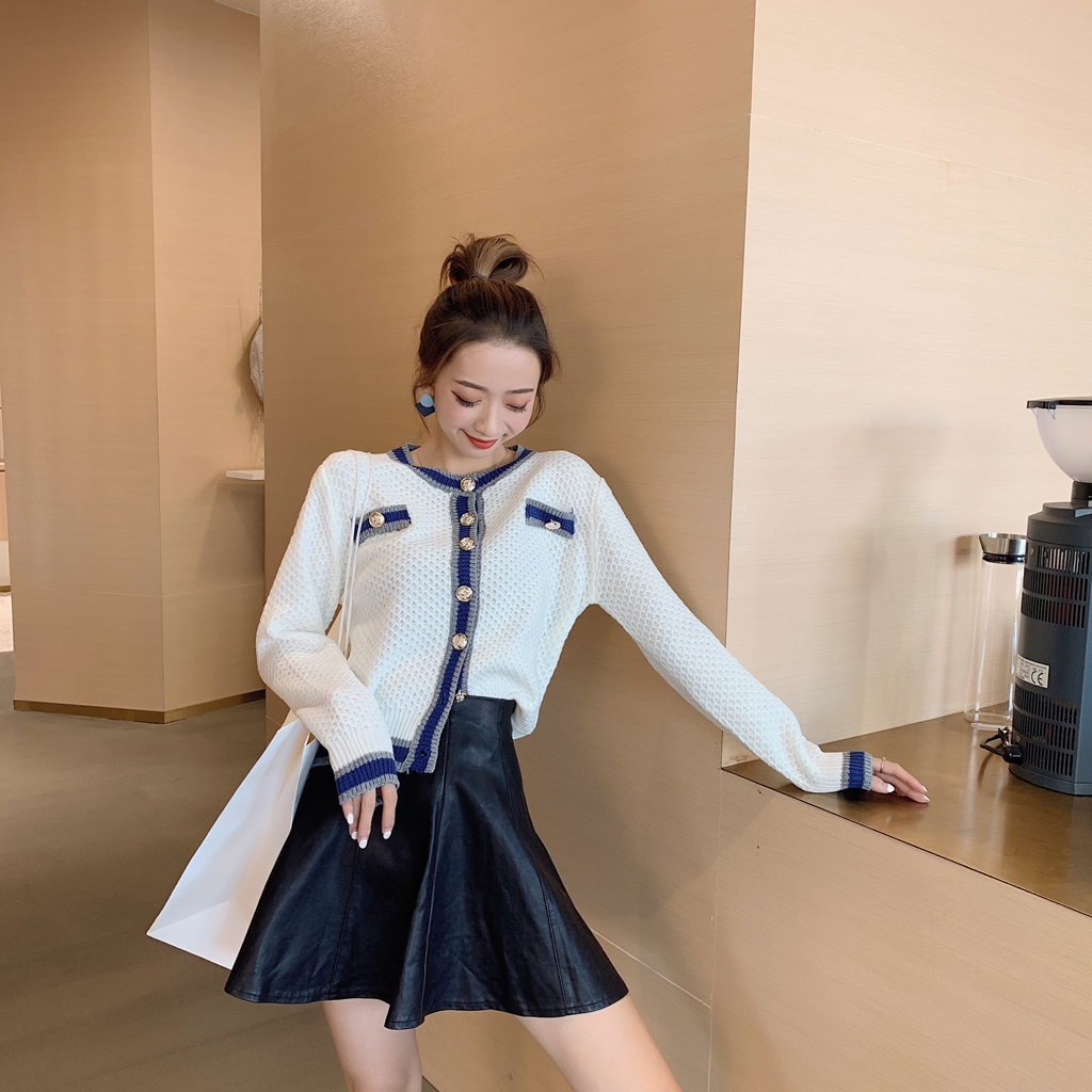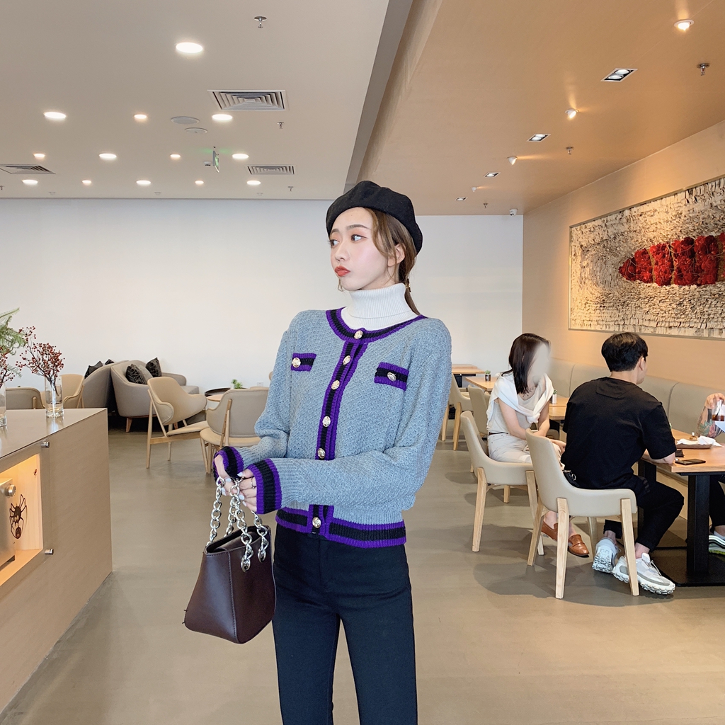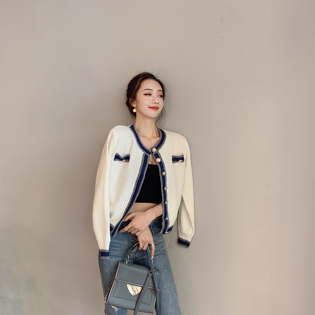 韓版復古氣質拼色開衫外套女秋冬季短款單排扣針織衫毛衣外搭上衣