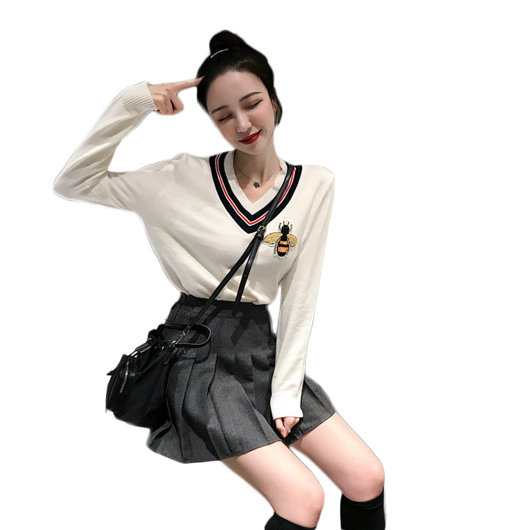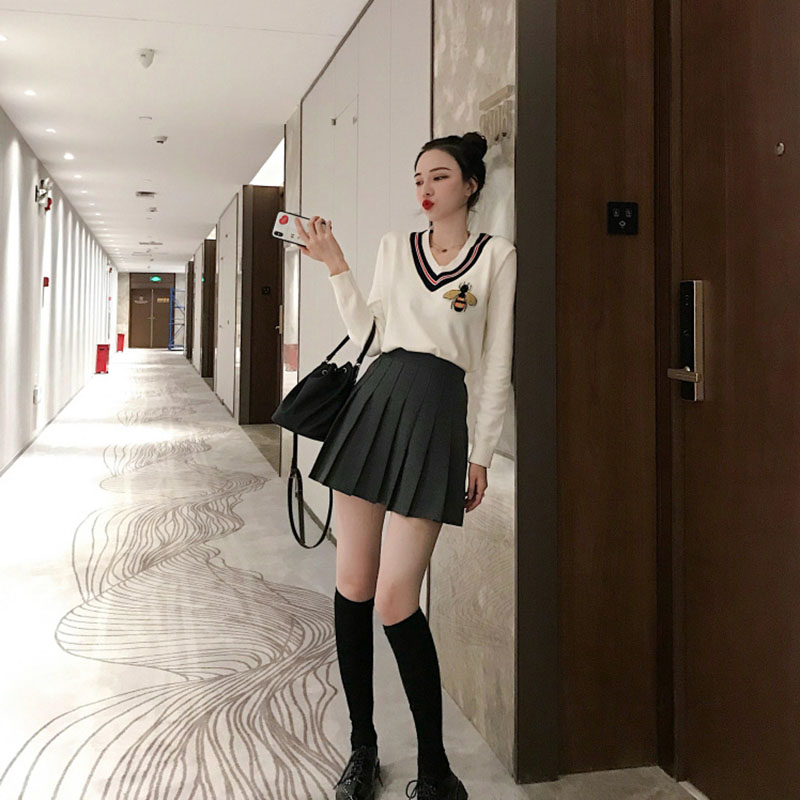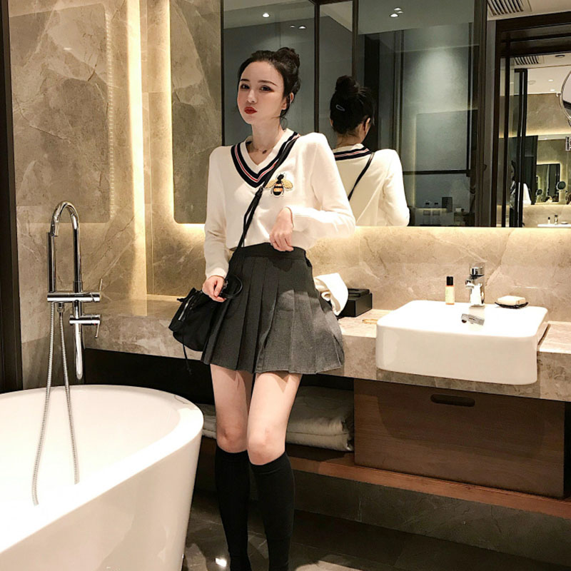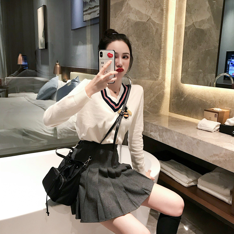 秋裝女2018新款韓版刺繡V領毛衣針織衫+毛呢褲裙百褶裙chic半身裙