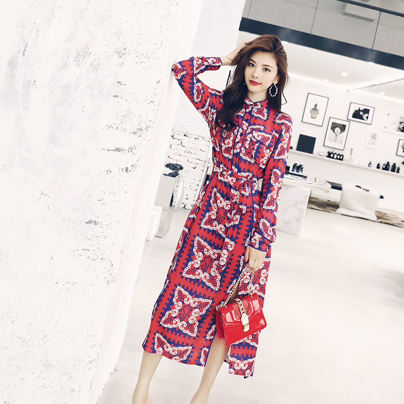 印花連衣裙長裙秋裝名媛氣質2018新款女裝復古收腰中長款襯衫裙子