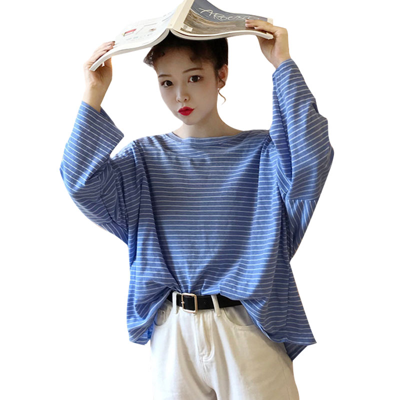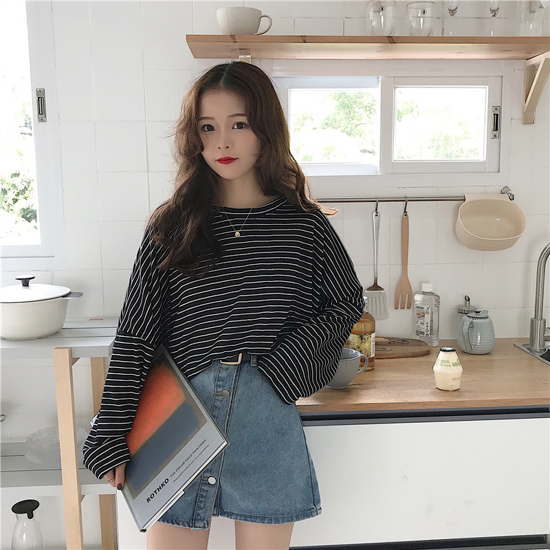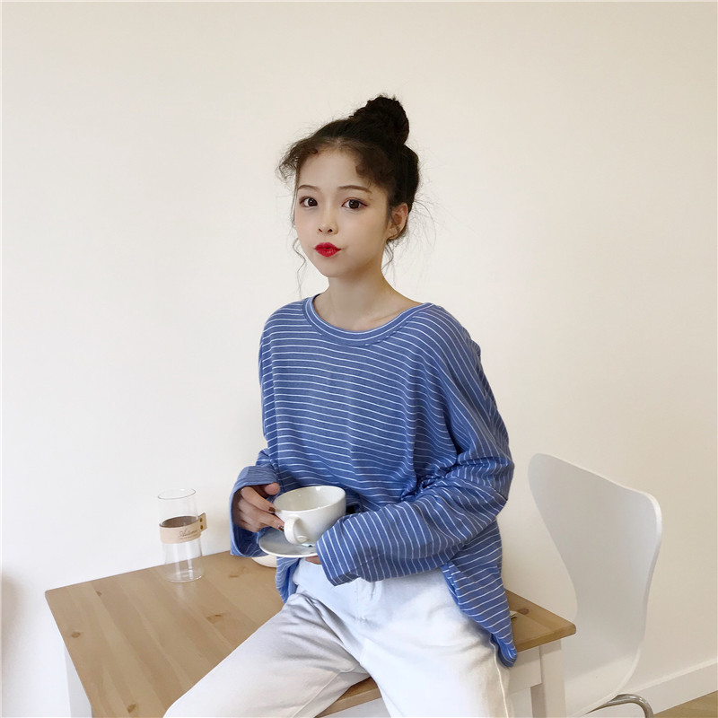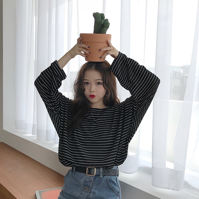 / 秋裝女裝韓版學院風寬松百搭長袖條紋t恤學生休閑顯瘦體恤上衣潮