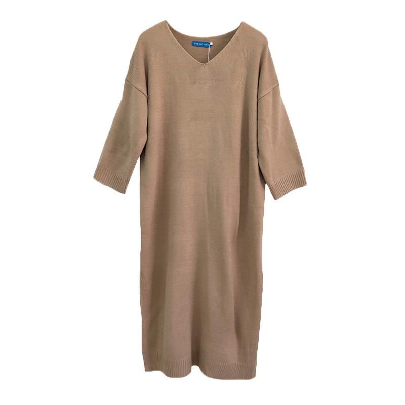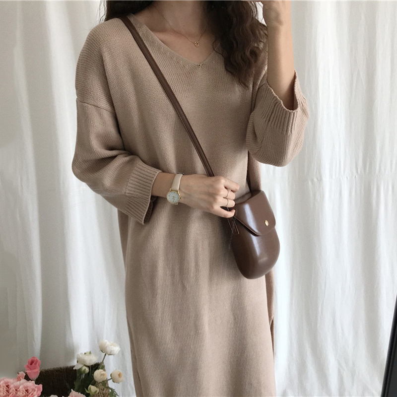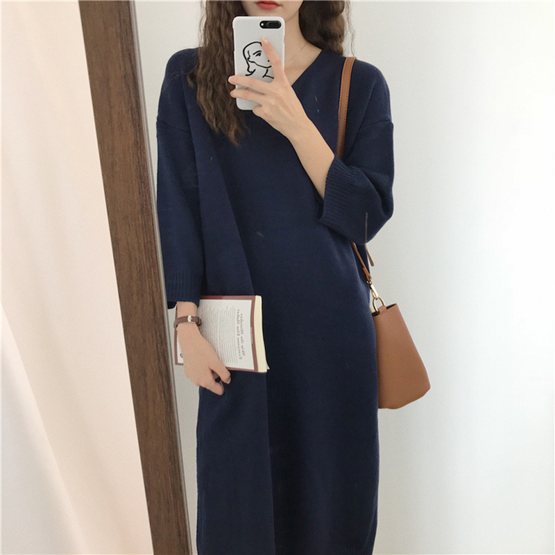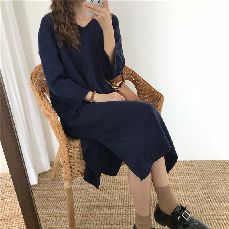 秋裝女2018新款寬松V領針織毛衣連衣裙韓版長袖純色開叉休閑裙子