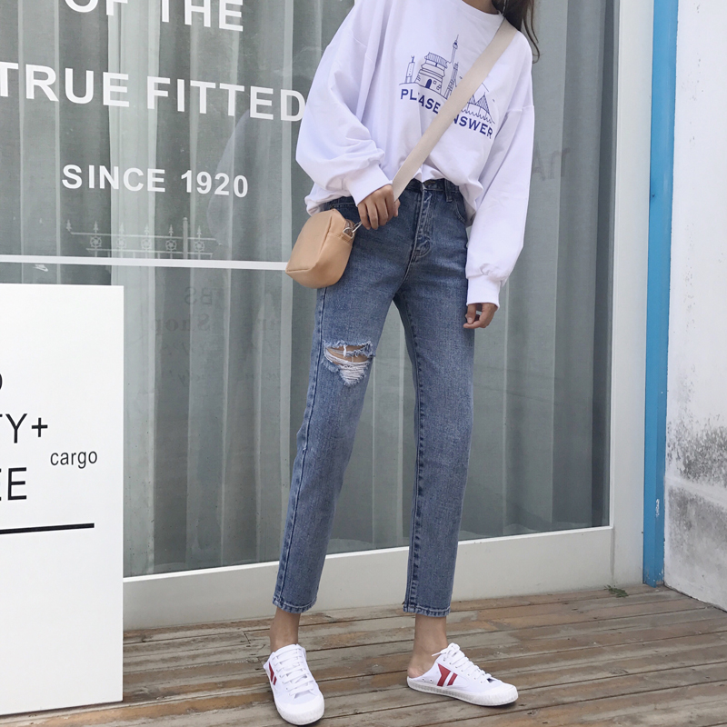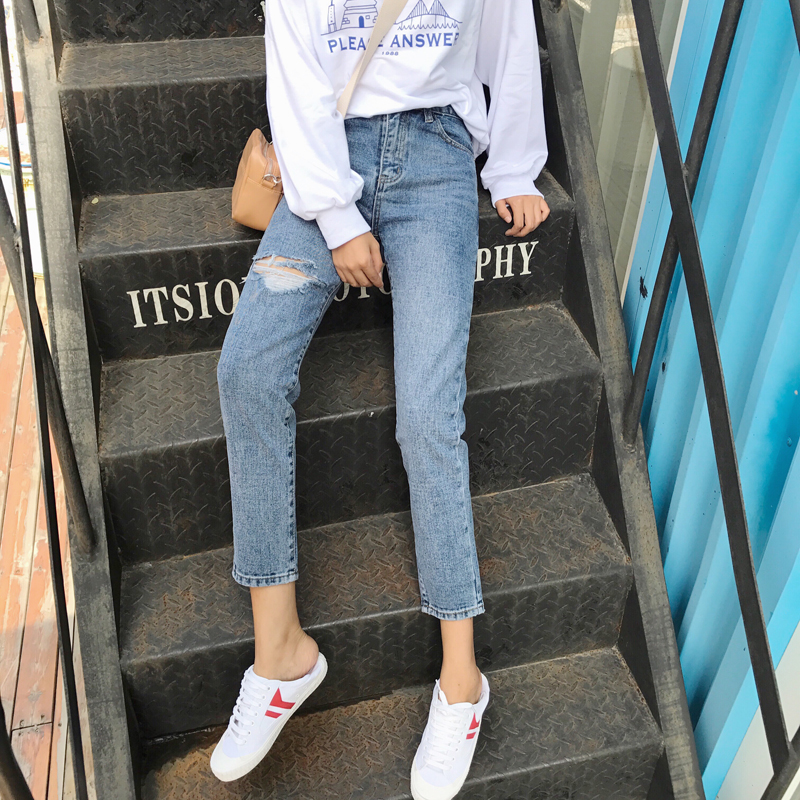 / 秋裝女裝韓版高腰個性膝蓋破洞牛仔褲百搭顯瘦九分褲直筒褲學生潮