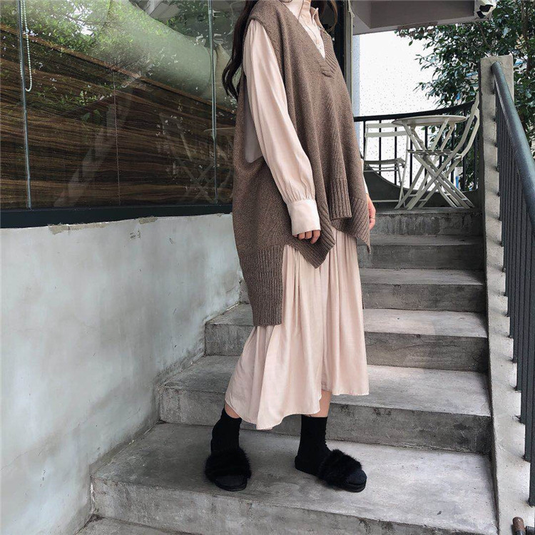 女神套裝秋復古寬松v領毛衣背心馬甲+初戀裙雪紡長袖連衣裙兩件套