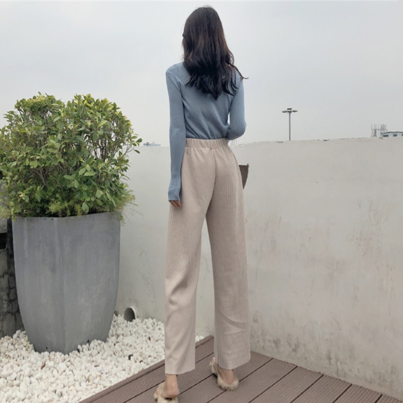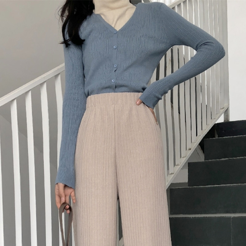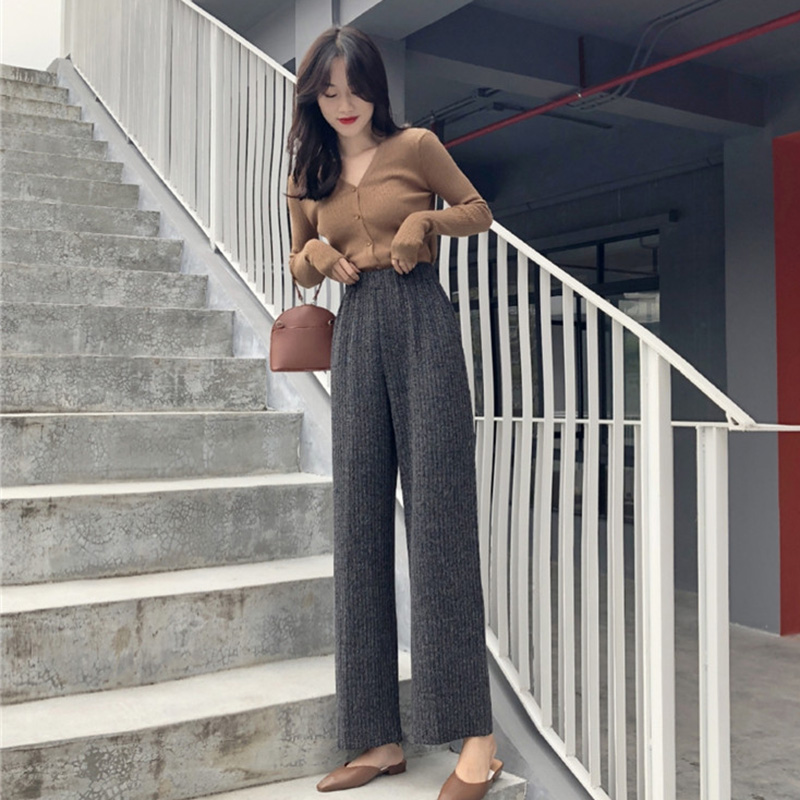 秋裝女2018新款韓版修身V領針織衫高腰顯瘦休閑九分闊腿褲子套裝