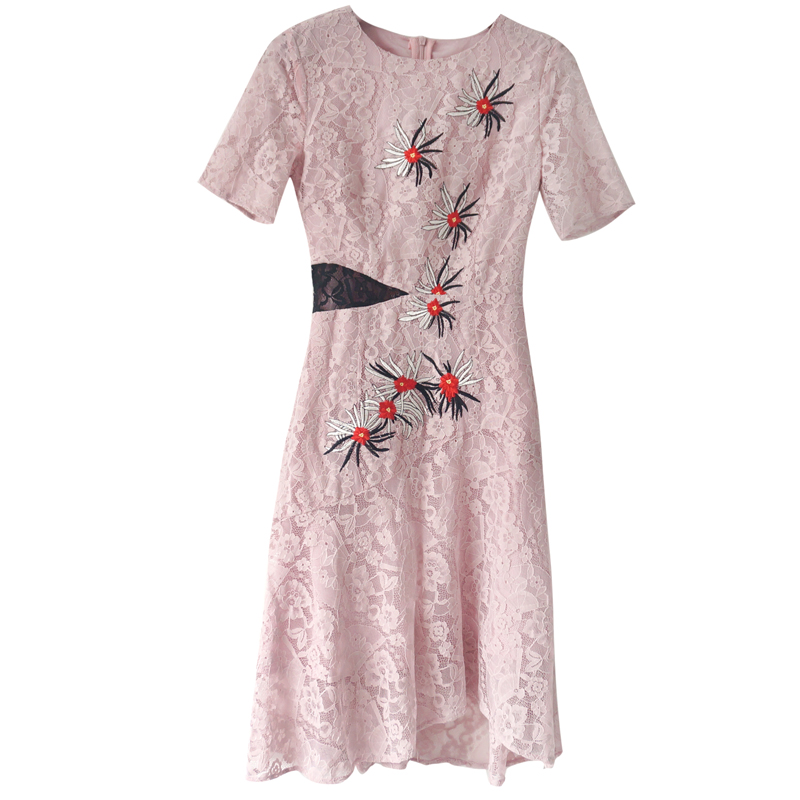 / S秀2018夏季新款繡花鏤空蕾絲連衣裙女純色淑女氣質顯瘦荷葉邊裙