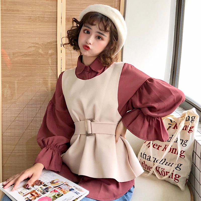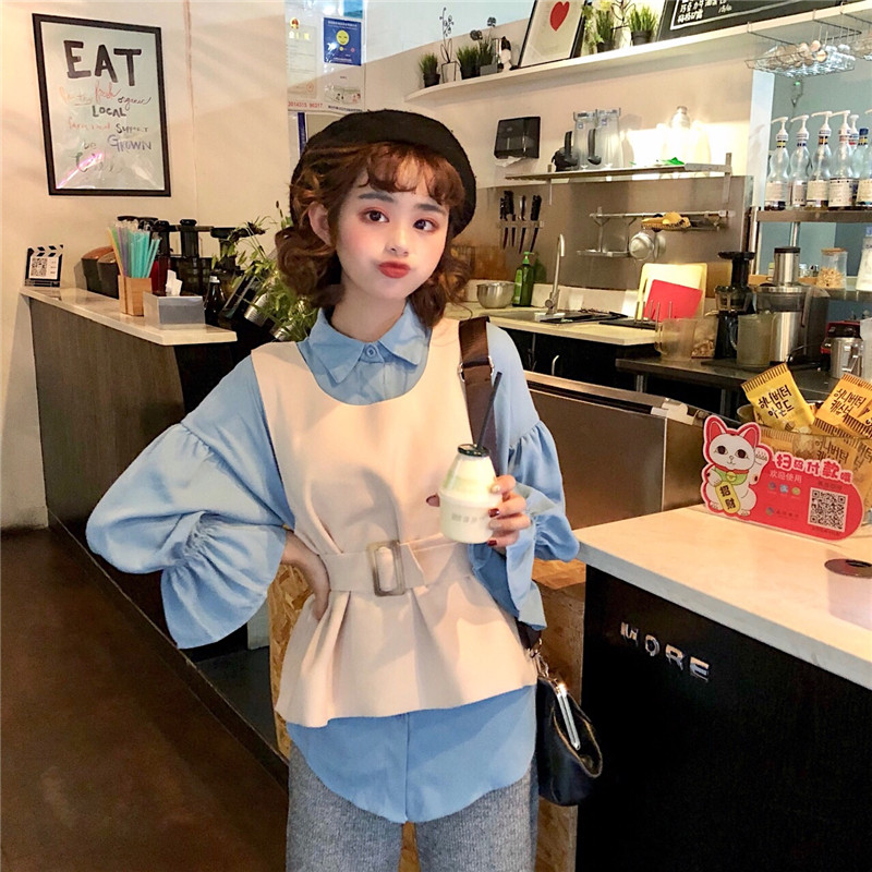 / 韓版時尚休閑套裝秋季寬松燈籠袖襯衫+呢料收腰馬甲背心兩件套女