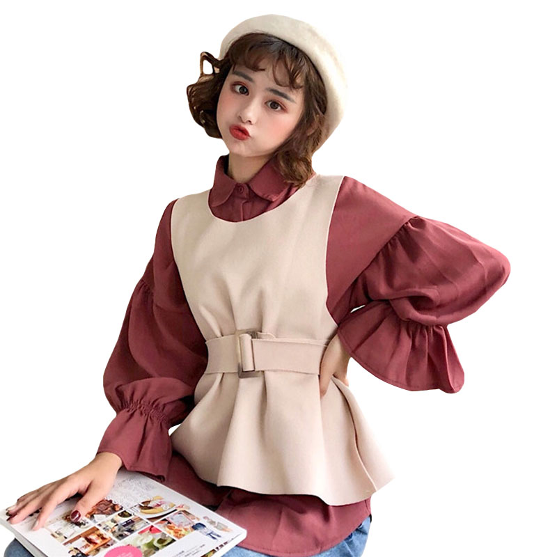 韓版時尚休閑套裝秋季寬松燈籠袖襯衫+呢料收腰馬甲背心兩件套女