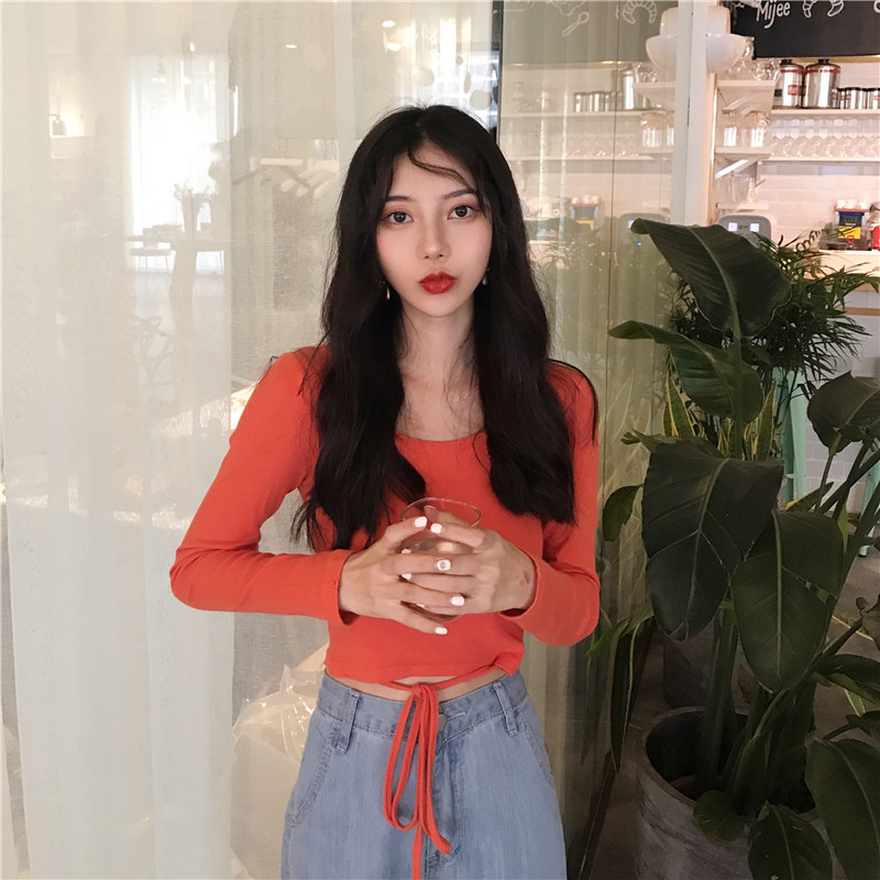 / 港味秋天上衣女時尚復古風修身顯瘦純色綁繩圓領百搭長袖打底T恤