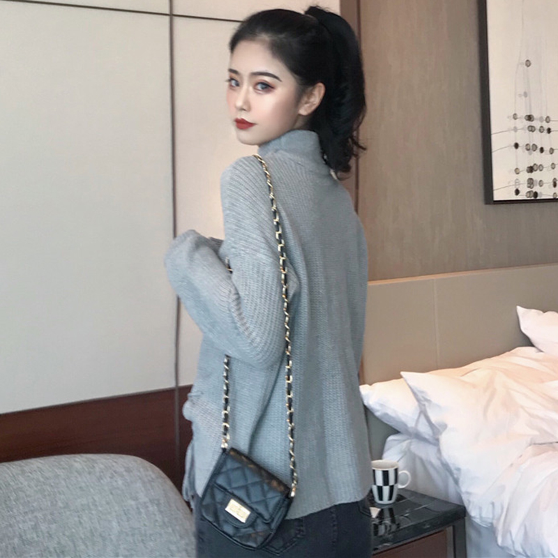/ 鏤空高領慵懶套頭毛衣女秋冬裝新款系帶純色寬松針織外套長袖上衣