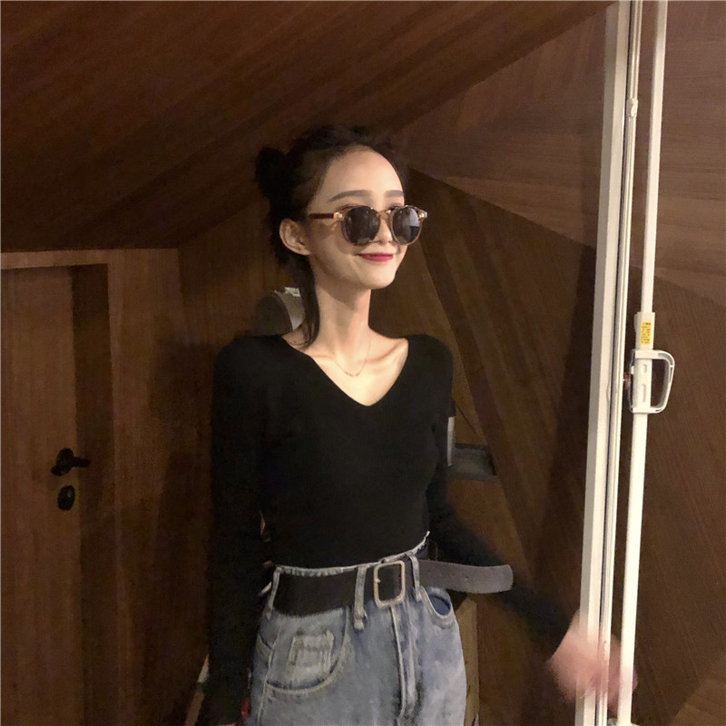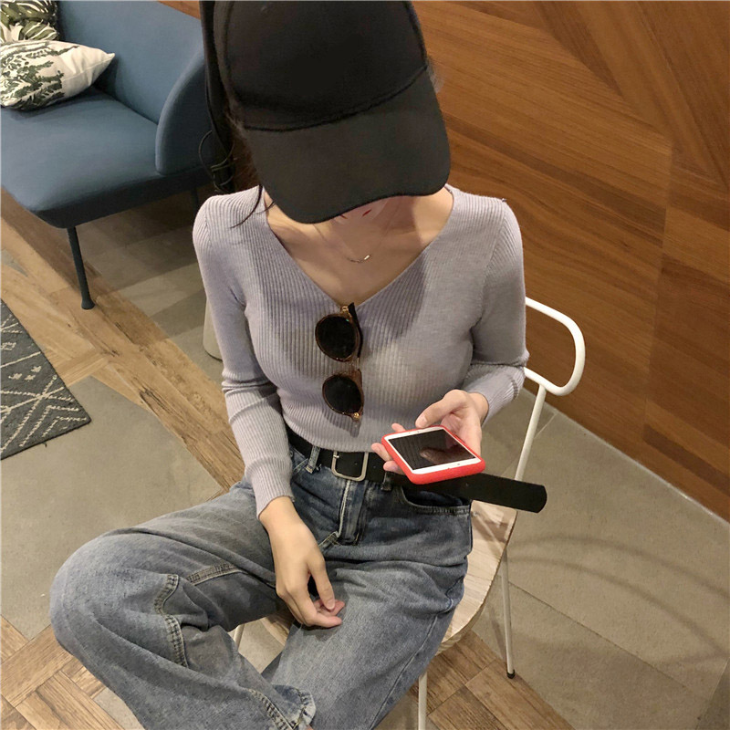 毛衣女套頭韓版2018新款早秋純色V領長袖修身顯瘦百搭打底針織衫