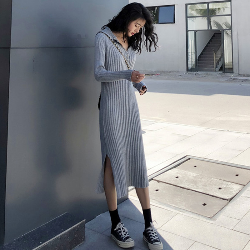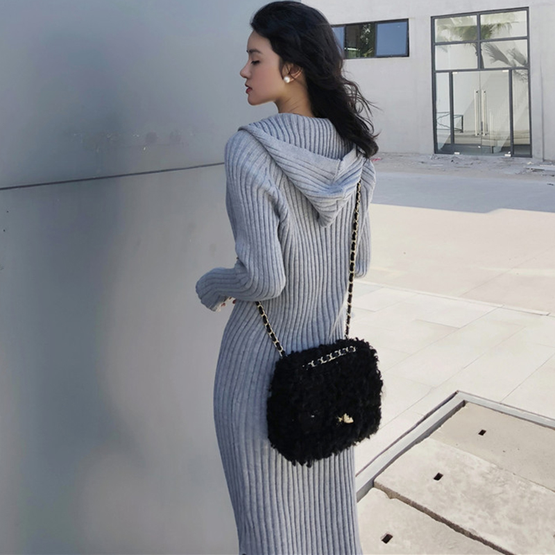 / eeg中長款開叉連衣裙子女秋冬裝2018新款韓版黑色顯瘦連帽針織裙