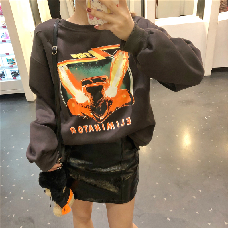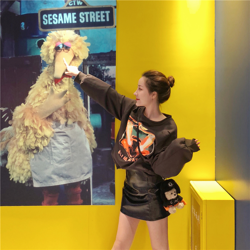 / 新款重工做舊港味印花加絨衛衣時尚套裝百搭高腰亮面皮裙兩件套女